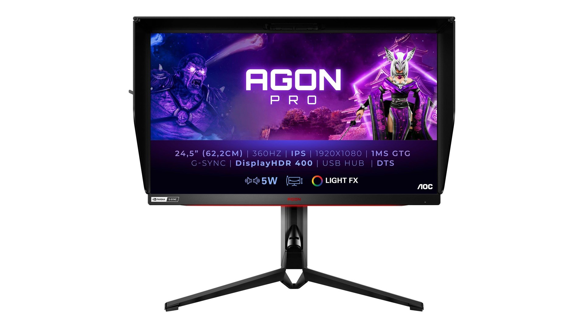 Spilmodus, FPS Mode, Low Blue Light Mode, Flicker Free-teknologi, RTS Mode, DTS Sound, AOC Shadow Control, Low Input Lag, Racing Mode, AOC Game Color, 3-sidet rammeløs, 8-bit Color Depth, NVIDIA Reflex Latency Analyzer, RGB Light FX, AGON QuickSwitch