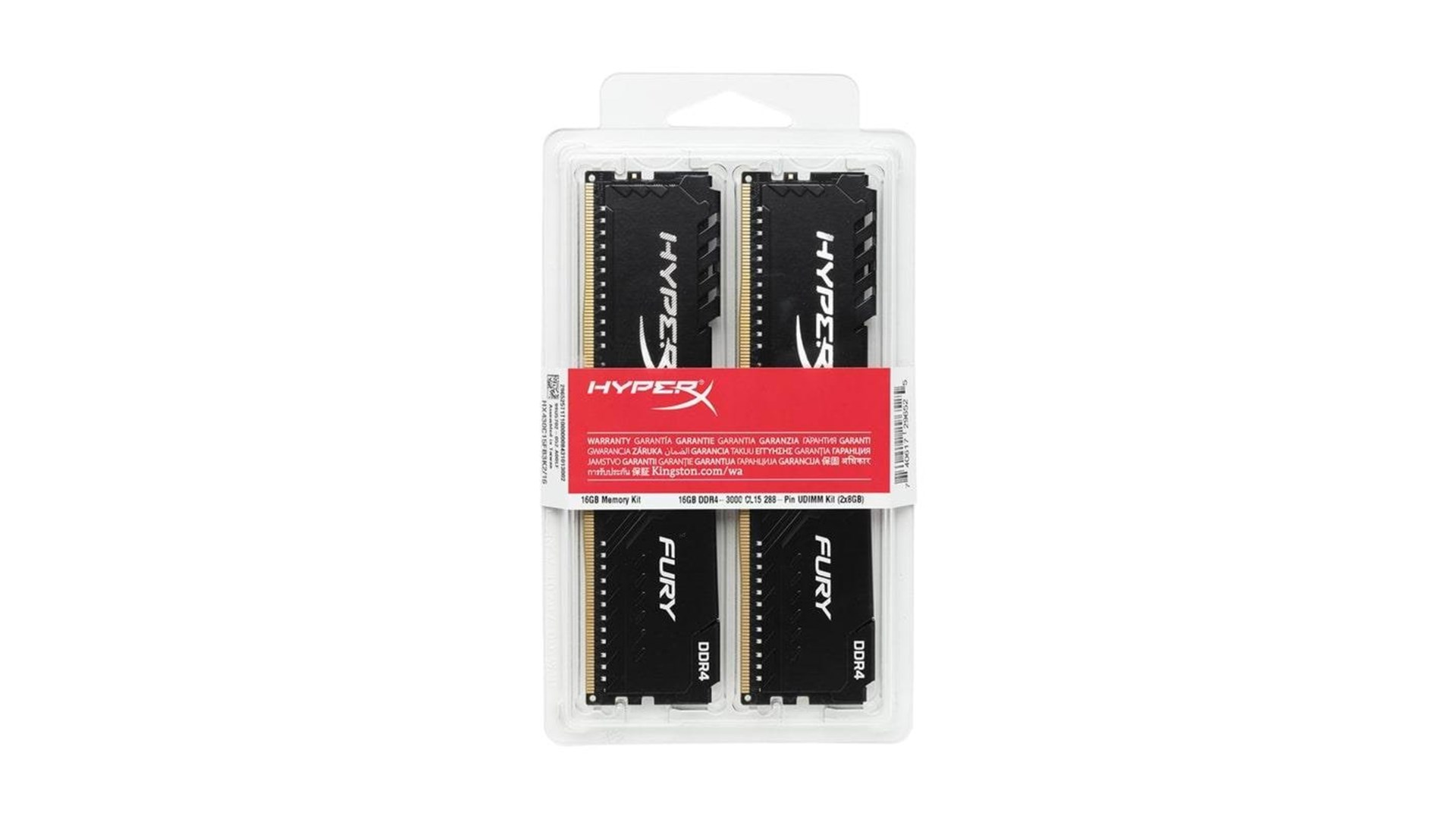 Single rank, sort køleribbe, On-Die Termination (ODT), Serial Presence Detect (SPD), Black PCB, lavprofils varmespreder, FURY asymmetrisk varmespreder, seksten rækker, Intel Extreme Memory Profiles (XMP 2.0), ikke bufferet