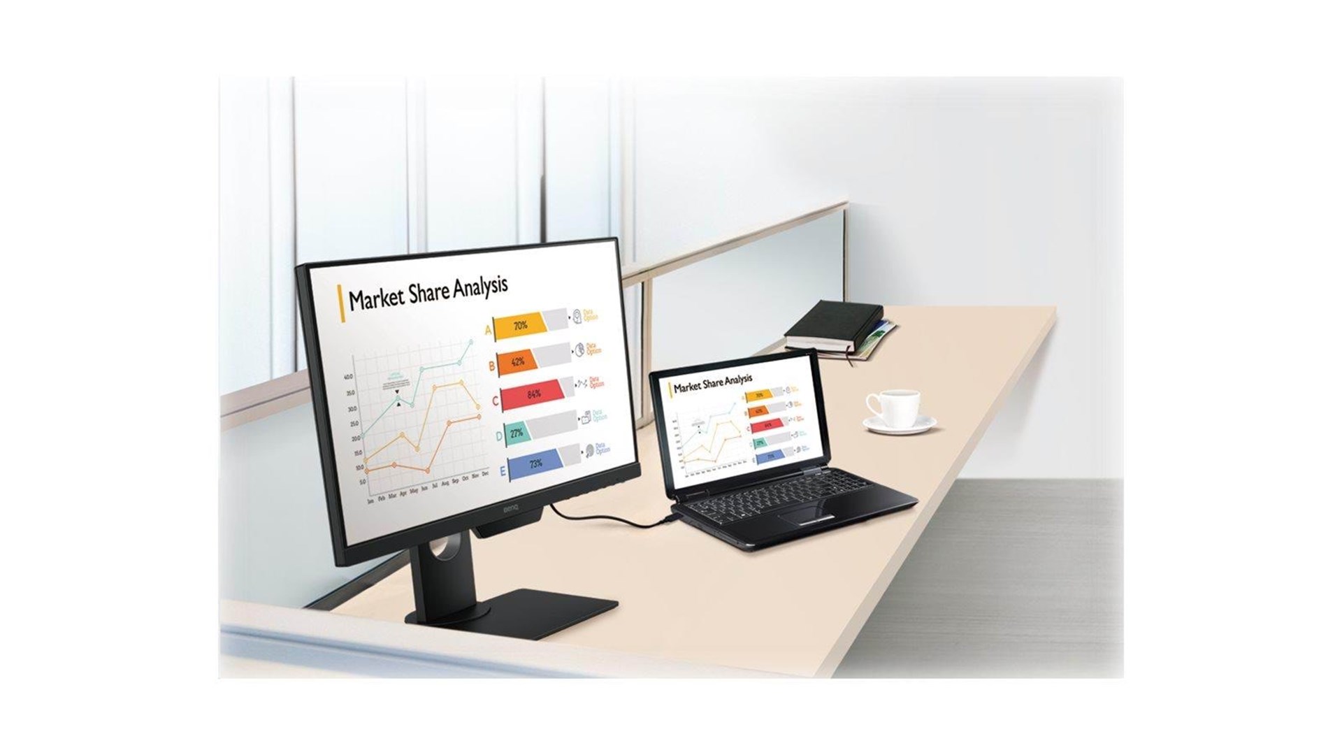 Designet af skærmen er minimalistisk og rammefri med en bezel på kun 6,63 mm, hvilket giver en mere sammenhængende visuel oplevelse, når du tilslutter flere skærme til et multi-display setup. Dette design gør også, at skærmen ser lettere og mere moderne ud, hvilket passer perfekt ind i ethvert kontormiljø.
