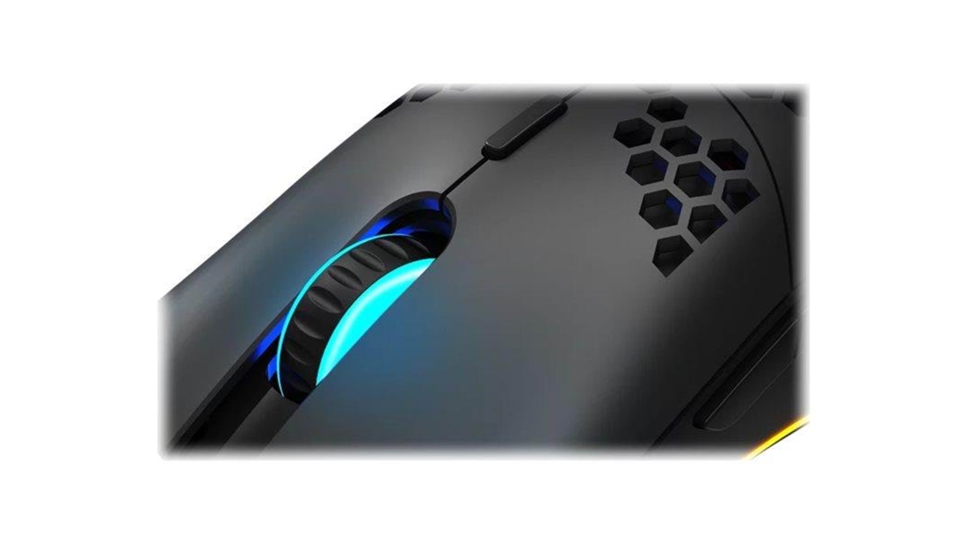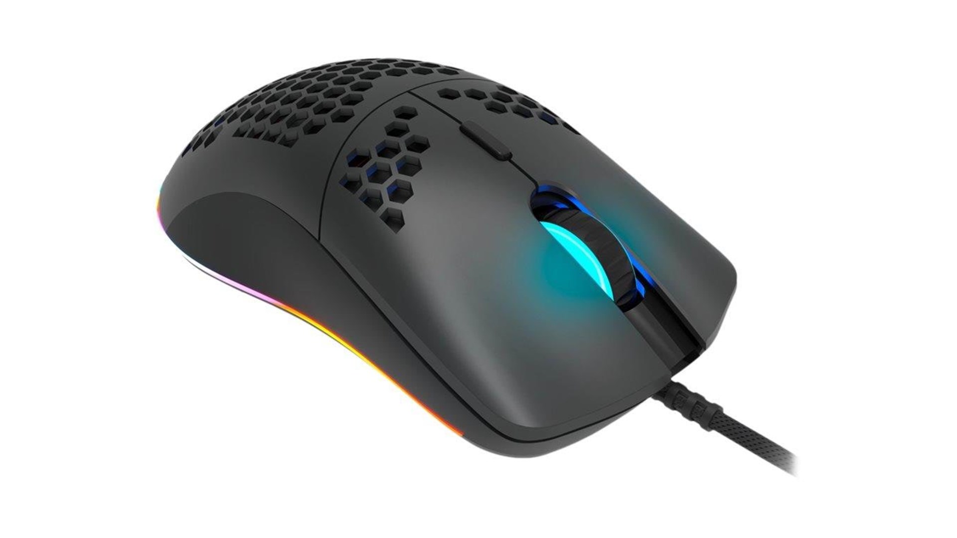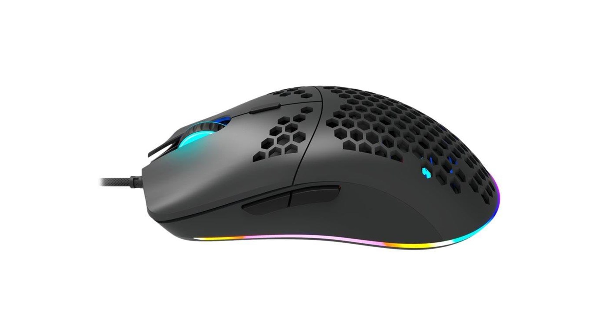 Scrollhjul, flettet kabel, UPE-fødder, 7 programmerbare knapper, magnetisk ferritring, 5 millioner klik, RGB-bagbelysning, Pixart PAW 3519 optisk spilsensor, perforeret kabinet
