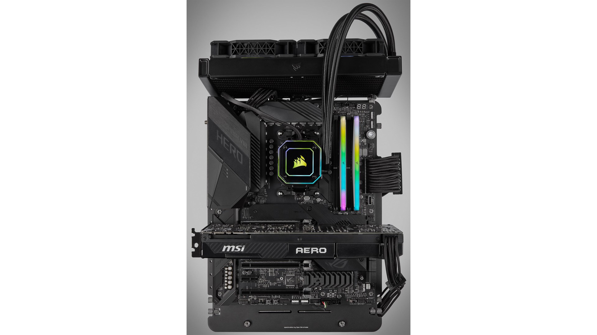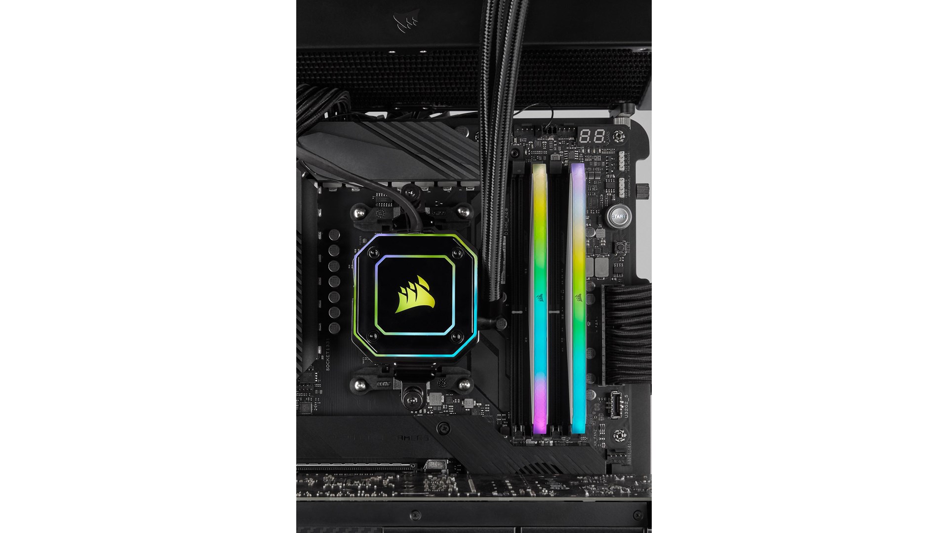 Dobbeltkanal, anodized aluminum heatspreader, Intel Extreme Memory Profiles (XMP 2.0), AMD Ryzen Ready, Corsair iCUE support, 10 RGB belysningszoner, ikke bufferet