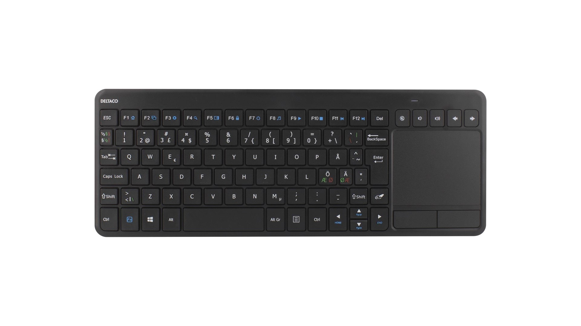 Deltaco TB-504 er et trådløst tastatur, der kombinerer komfort og funktionalitet med et stilrent design. Dette tastatur anvender 2.4 GHz teknologi, hvilket sikrer en stabil forbindelse uden problemer med forsinkelse eller interferens. Deltaco TB-504 er perfekt til brug med både stationære og bærbare computere, hvilket gør det ideelt til hjemmekontoret, stuen eller præsentationsmiljøer.\n\nEn af de centrale funktioner ved Deltaco TB-504 er den indbyggede touchpad, som giver brugeren mulighed for at navigere let uden behov for en separat mus. Dette er særligt praktisk, når man sidder tættere på skærmen, hvor pladsen er begrænset. Tastaturets nordiske layout inkluderer de danske tegn Æ, Ø og Å, hvilket gør det perfekt til danske brugere.\n\nDeltaco TB-504 er konstrueret af holdbare materialer, der kan tåle daglig brug. Tastaturet er designet til at være slidstærkt, hvilket sikrer lang levetid og pålidelig ydeevne. Den membrane kontakt sikrer en blid og stille taster med en behagelig skriveoplevelse, hvilket er ideelt for både skrivning af dokumenter og afslappet browsing.\n\nMed en vægt på kun 302 gram og slanke dimensioner på 325x125x15mm er Deltaco TB-504 let at transportere og passer godt ind i de fleste arbejdsstationer. Den trådløse modtager tilsluttes nemt via en USB-port, hvilket gør installationen hurtig og problemfri.\n\nDeltaco TB-504 henvender sig til en bred målgruppe, herunder studerende, professionelle og hjemmebrugere, der ønsker en effektiv og kompakt løsning til deres computerbehov. Uanset om det er til dagligdags opgaver, gaming eller streaming af video, leverer dette tastatur en solid og funktionel oplevelse.\n\nAfslutningsvis er Deltaco TB-504 det perfekte valg for dem, der ønsker et trådløst tastatur med touchpad, der kombinerer funktionalitet med et elegant design. Med gode ergonomiske funktioner og brugervenlighed er det ideelt til både arbejde og underholdning.