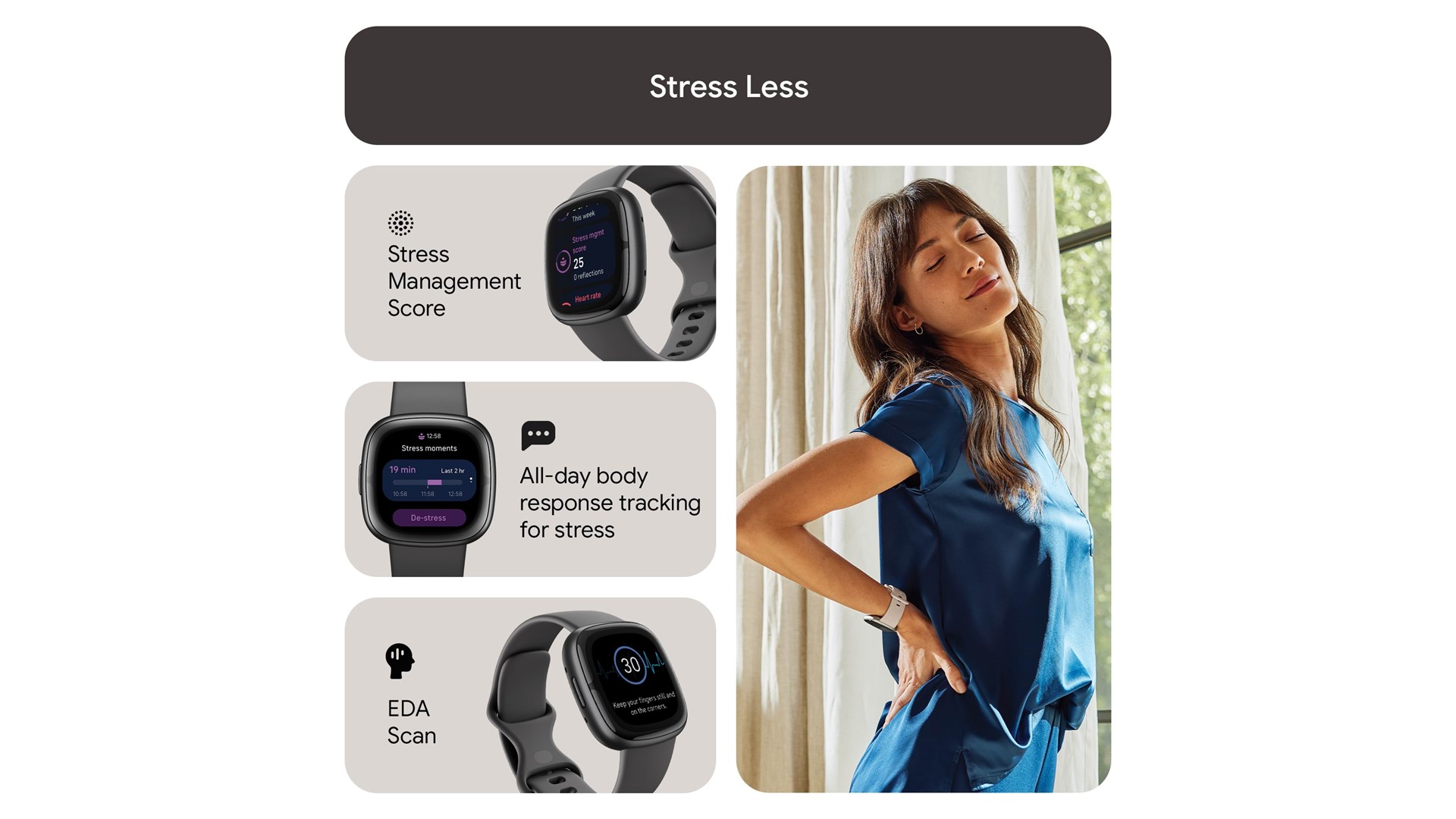 Distance, kalorier forbrændt, aktivitet, søvnaktivitet, hjertefrekvens, trin taget, hudtemperatur, hastighed, søvnstadier, stressniveau, menstruationscyklus, Resting Heart Rate (RHR), hjertefrekvensvariabilitet, åndedragshastighed, ECG, søvnkvalitetsscore