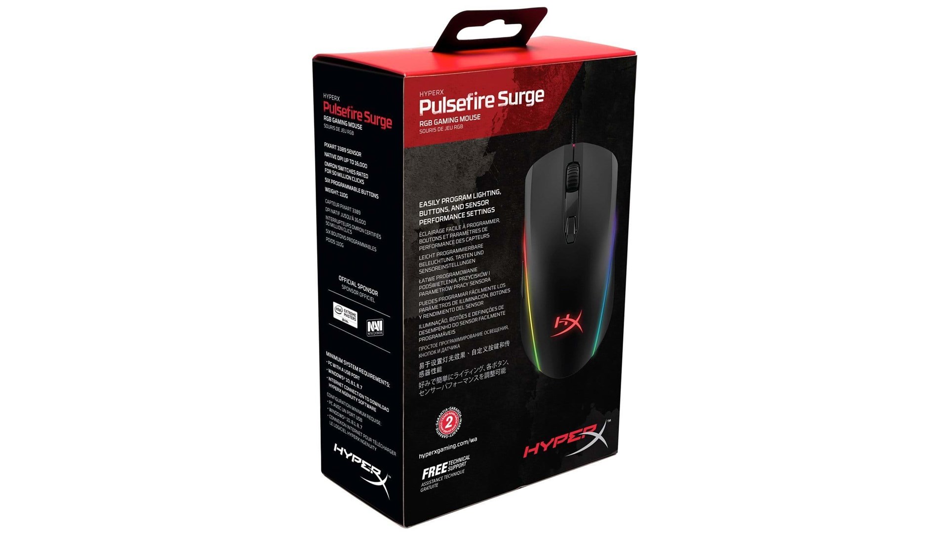 Flettet kabel, 3 profiler, 6 programérbare knapper, OMRON-kontakter, brightness adjustment, justerbar RGB LED-belysning, Pixart PMW 3389 optisk spilsensor