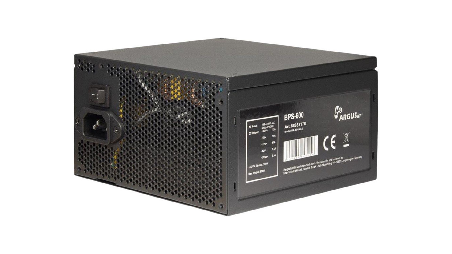 Inter-Tech 88882178, også kendt som Argus BPS-600, er en pålidelig og effektiv ATX strømforsyning, der er designet til at levere en stabil strømforsyning til moderne PC'er. Med en effektkapacitet på 600 Watt og en 80 PLUS Bronze certificering er denne strømforsyning ideel til både gaming- og kontorskabe, der kræver en solid og effektiv strømlevering. Den lever op til 88,7% effektivitet under belastning, hvilket ikke blot betyder lavere energiforbrug, men også en reduktion i varmeudvikling, hvilket kan forlænge levetiden for dit udstyr.