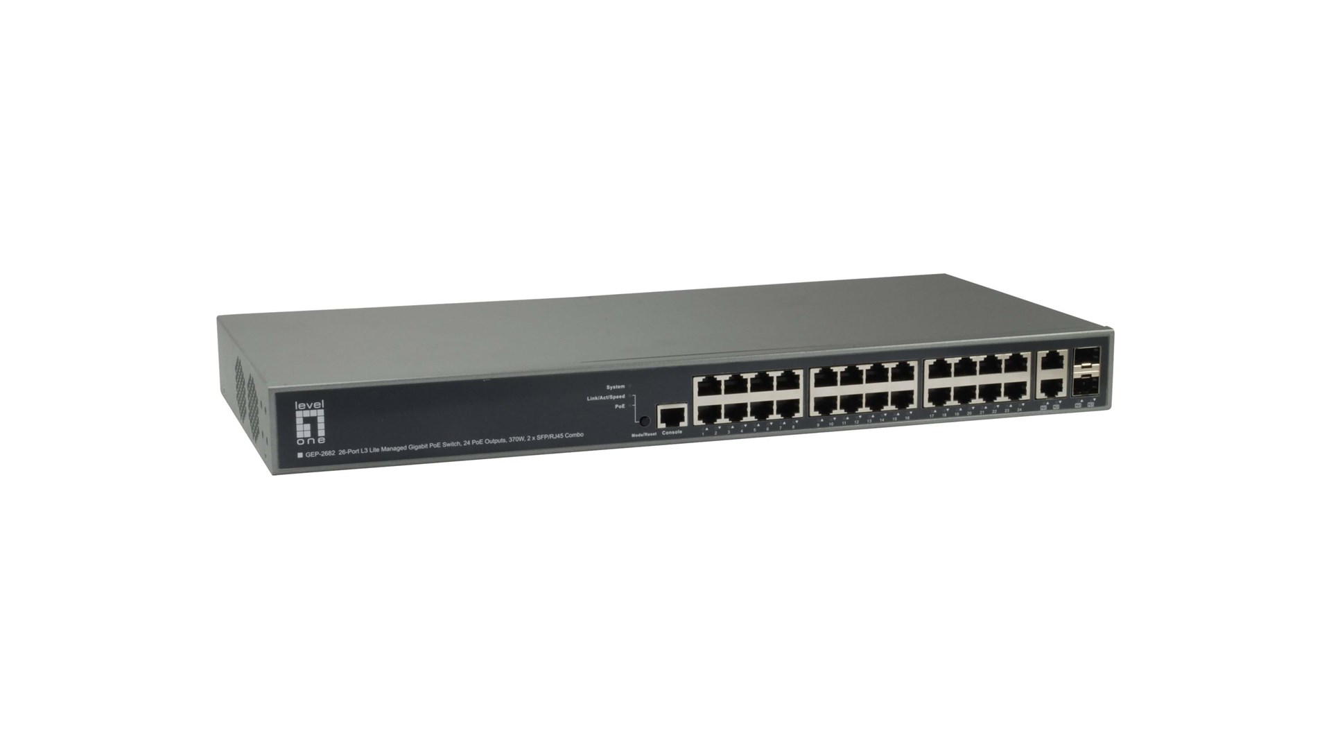 LevelOne GEP-2682 er en avanceret netværksswitch, der leverer en effektiv løsning til netværk med behov for høj kapacitet og fleksibilitet. Denne model er udstyret med 26 porte, herunder 24 porte, der understøtter PoE+ (Power over Ethernet), samt 2 Gigabit SFP-porte, der muliggør hurtig og pålidelig netværkstilslutning. Switchens anvendelse er ideel til både små og mellemstore virksomheder, der ønsker at optimere deres netværksinfrastruktur.