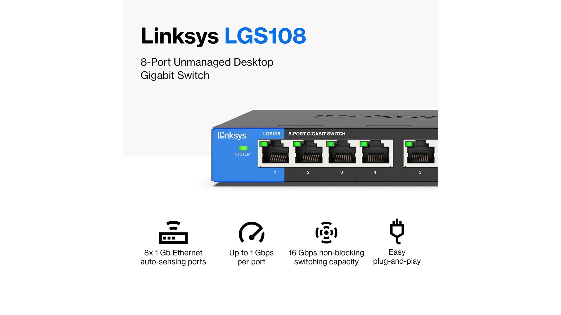 Linksys LGS108-EU er en stærk og pålidelig switch designet til at imødekomme behovene hos både små virksomheder og hjemmekontorer. Med sine 8 porte tilbyder denne ikke-administrerede switch en nem og effektiv løsning til at forbinde flere enheder i dit netværk uden behov for komplicerede opsætninger. Uanset om du skal forbinde computere, printere eller netværkssikkerhedssystemer, gør LGS108-EU det muligt at skabe en problemfri og hurtig forbindelse.