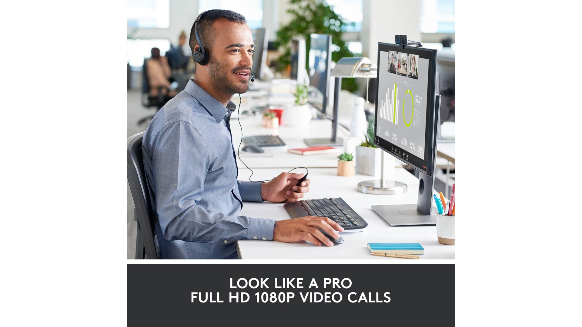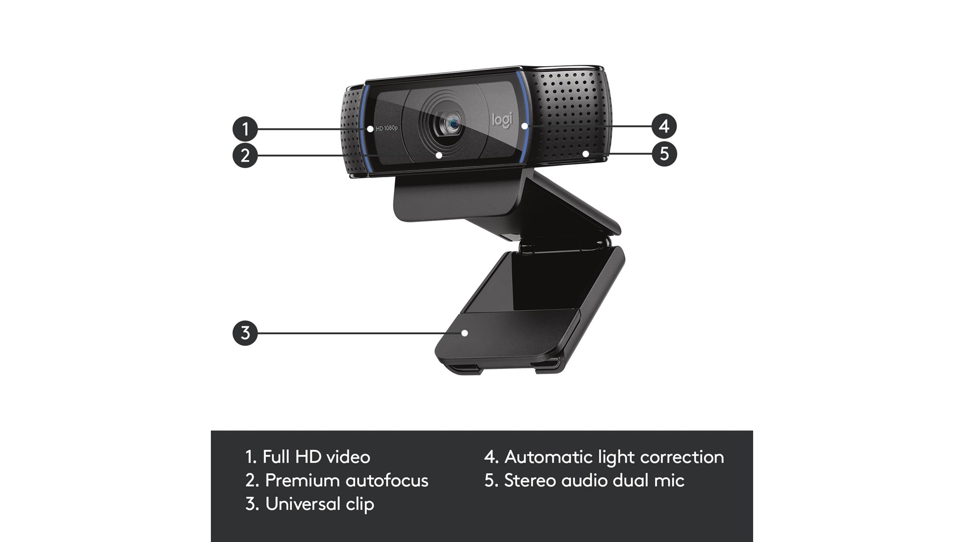 720 p HD videosamtaler, Carl Zeiss optik, Logitech Fluid Crystal Technology, 1080 p fuld HD videoopkalde på Skype, 1080 p Full HD filmoptagelse, kompatibel med Skype