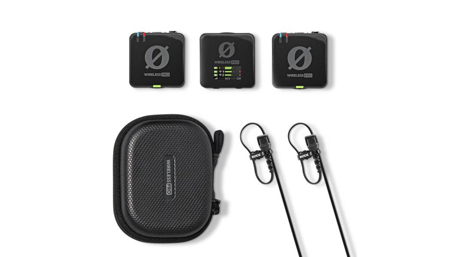 Dobbeltkanalmodtager, opladningsetui, 2 Lavalier II microphones, tilbehørs taske, 2 MagClip GO magnetic mounting clips, 3 pelsede vindskærme, 2 transmissionsenheder, 2 USB-C to USB-C cables, 3,5 mm audiokabel, Lightning til USB-C-kabel