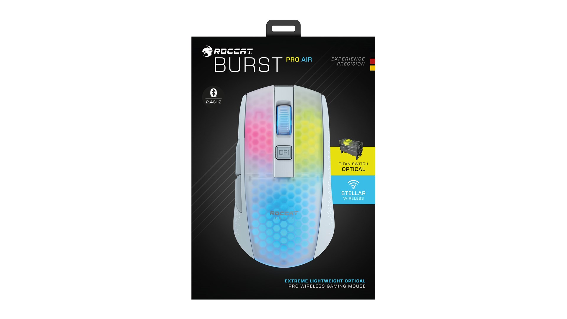 Polytetrafluoroethylene (PTFE) feet, vandtæt, støvsikker, justerbar elevatordistance, 5 profiler, Owl-Eye optisk sensor, 4 RGB-zoner, ROCCAT Titan Switch Optical, hurtig opladning, ROCCAT bionisk skal, PhantomFlex-kabel, NVIDIA Reflex, Stellar Wireless-teknologi, varmebehandlede skydere, AIMO lighting system