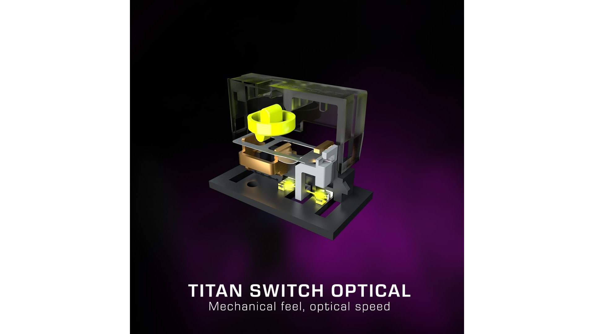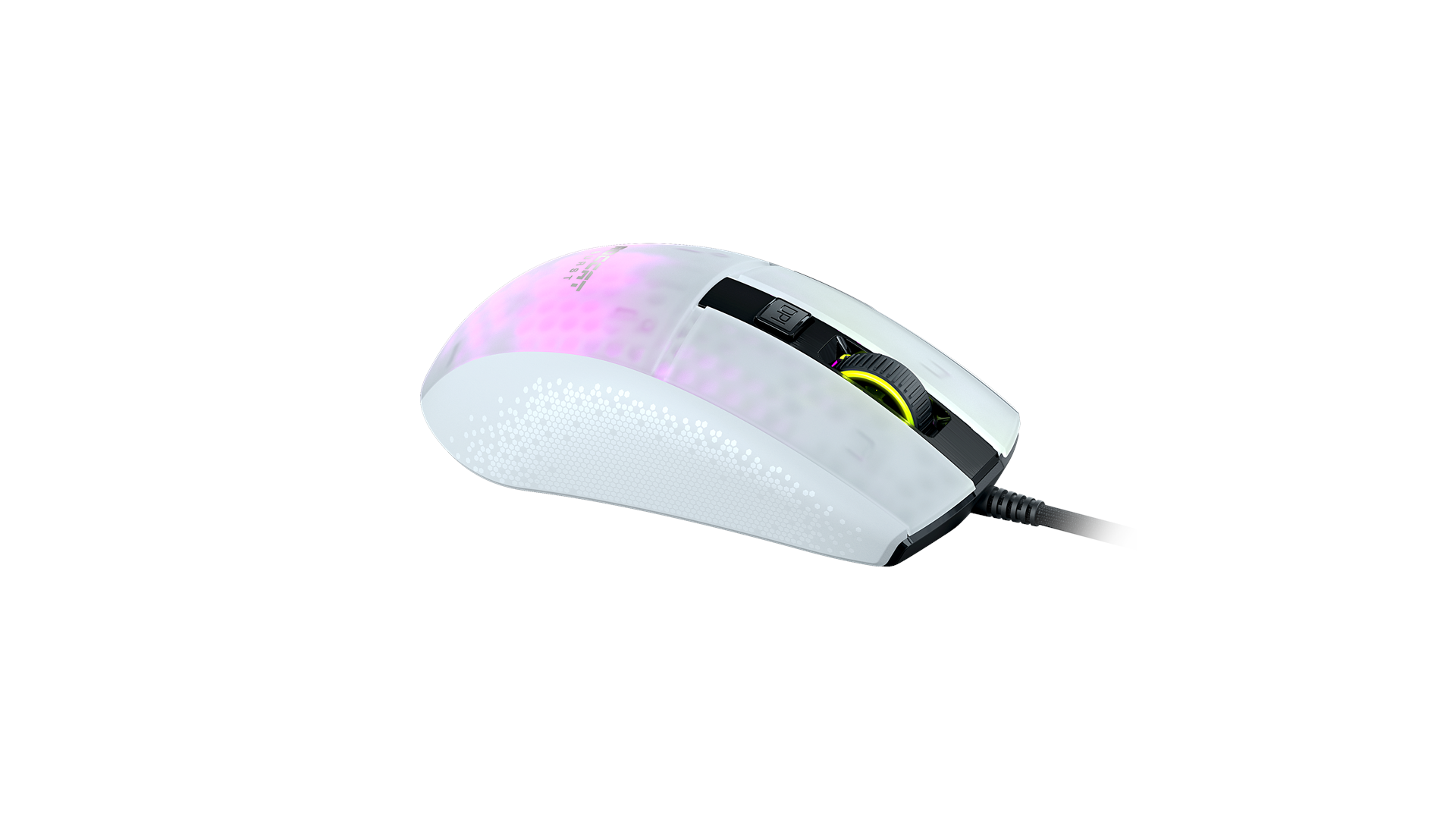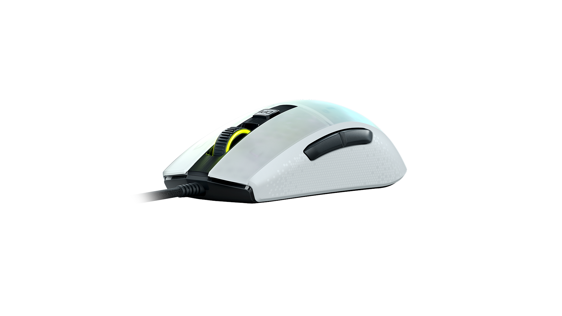 Scrollhjul, polytetrafluoroethylene (PTFE) feet, EasyShift[+] knap, justerbar elevatordistance, Owl-Eye optisk sensor, bikageskal-kabinet, ROCCAT Titan Switch Optical, AIMO lighting system