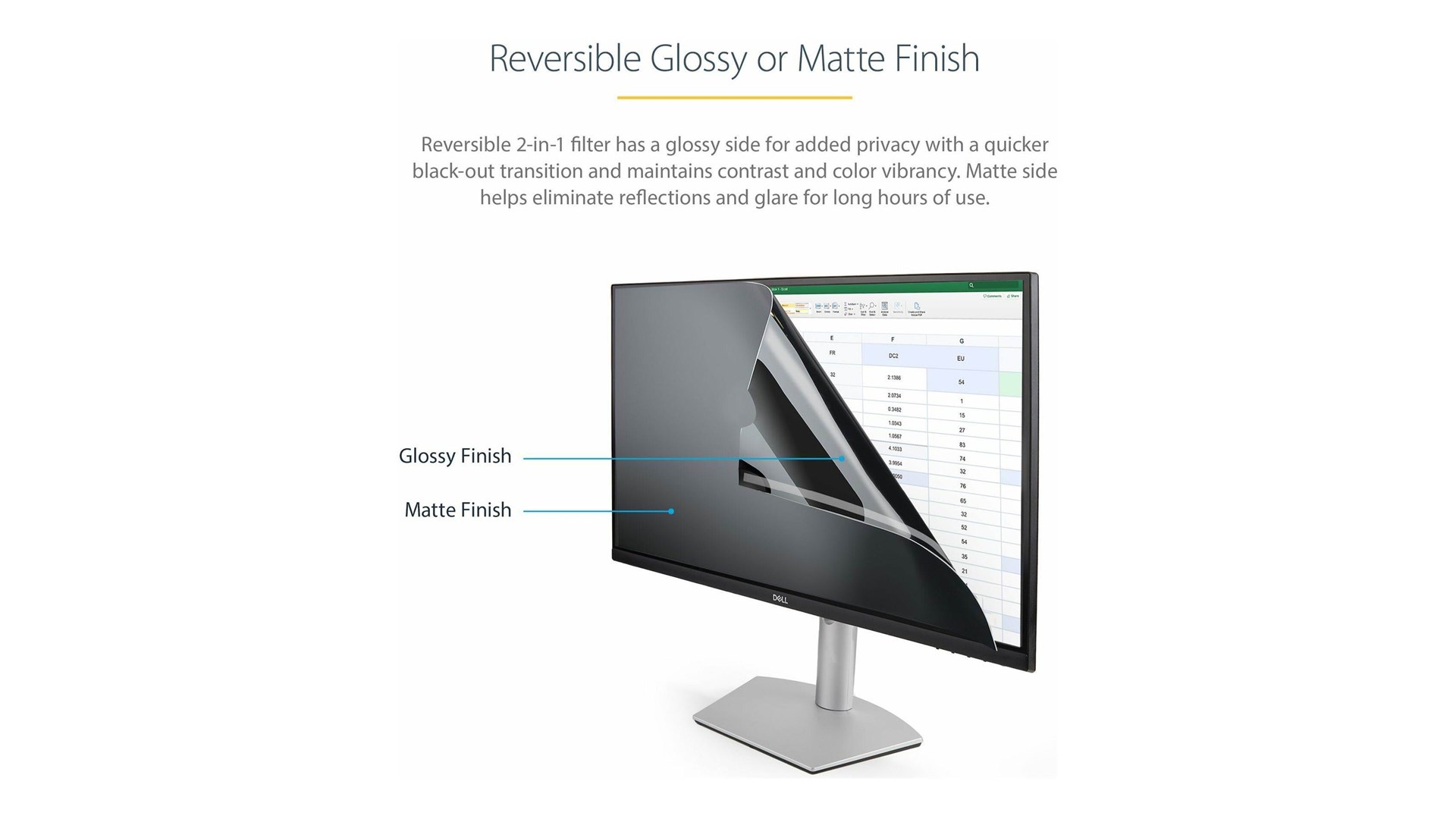 Produktet anvendes nemt ved at fastgøre det til din skærm ved hjælp af medfølgende klæbende strips eller ved at montere det med slide-mount tabs. PRIVACY-SCREEN-20M er også reversibel, hvilket betyder, at du kan vælge mellem den matte side, som reducerer blænding, og den glatte side, der giver en højere billedkvalitet, afhængig af behov og miljø.