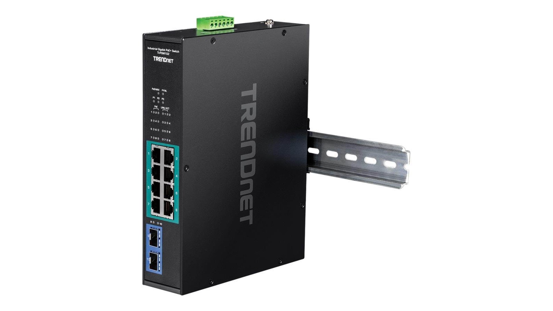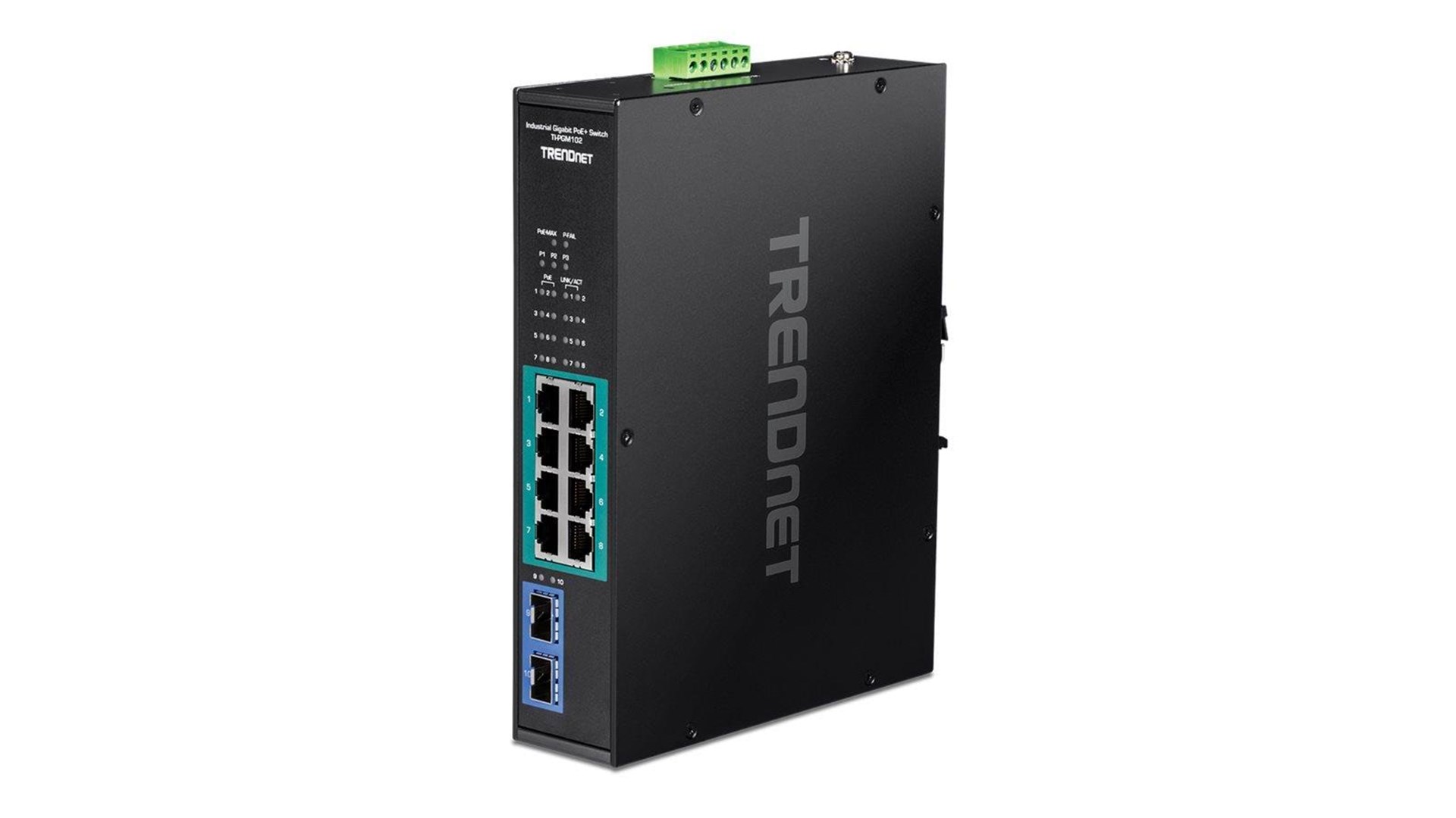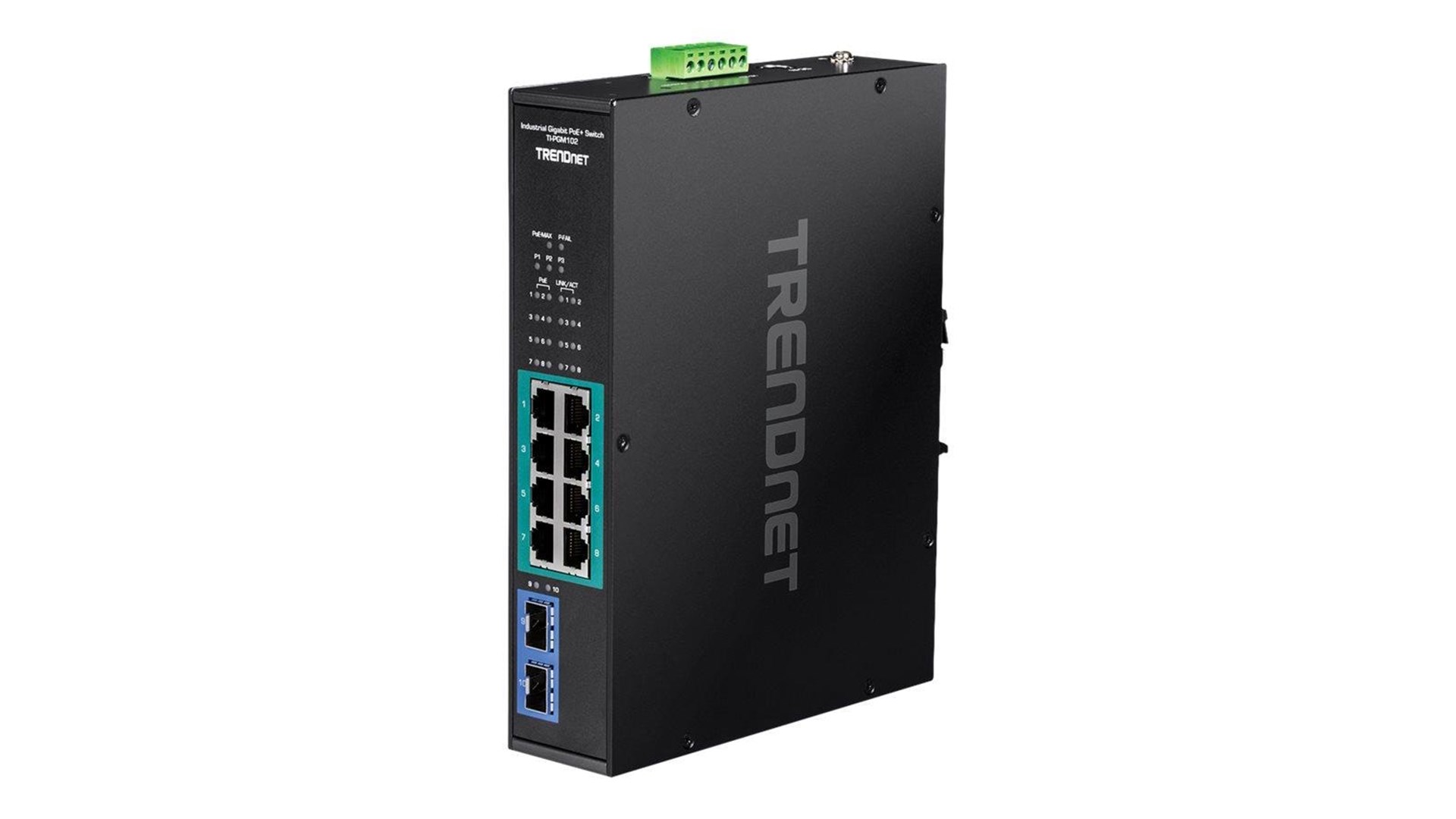 TRENDnet TI-PGM102 er en industriel Gigabit PoE+ switch designet til at håndtere forskellige netværksbehov i krævende miljøer. Med sit robuste og kompakte design er den ideel til både professionelle og industrielle applikationer, hvor pladsen er trang, og pålidelighed er altafgørende. Denne switch har i alt 10 porte, hvoraf 8 er udstyret med PoE+ (Power over Ethernet) funktionalitet, hvilket gør det muligt at levere strøm til tilsluttede enheder såsom IP-kameraer, adgangskontroller og WLAN-Access Points direkte via netværkskablet, hvilket reducerer behovet for separate strømkilder.