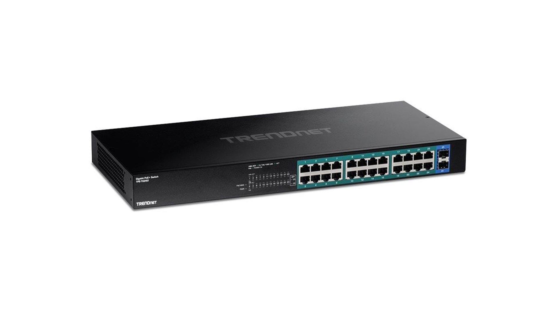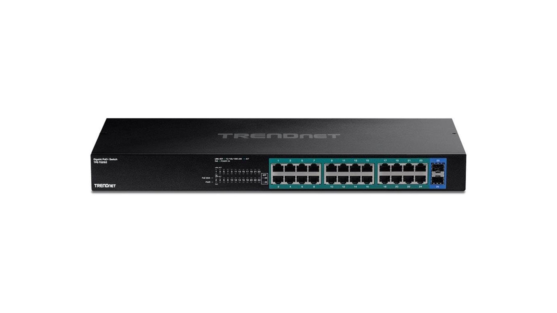 TRENDnet TPE-TG262 er en kraftfuld 26-porte Gigabit PoE+ switch designet til at imødekomme forskellige netværksbehov i både små og mellemstore virksomheder. Denne switch tilbyder 24 Gigabit PoE+ porte, der leverer op til 30W per port, hvilket gør den ideel til tilslutning af PoE-enheder som IP-kameraer, adgangspunkter og VoIP-telefoner. Med en samlet PoE-effektkapacitet på 380W er TPE-TG262 perfekt til at understøtte tungere netværk uden behov for ekstra strømkilder.