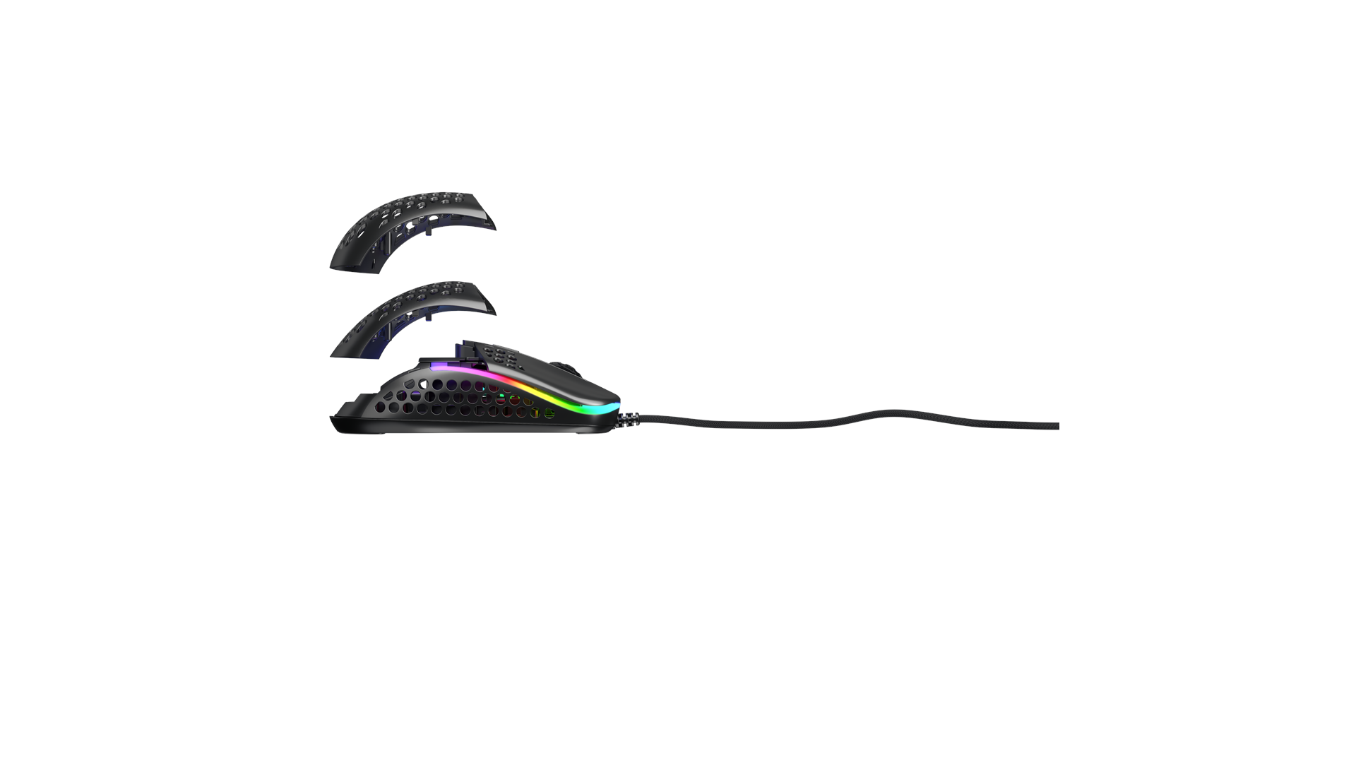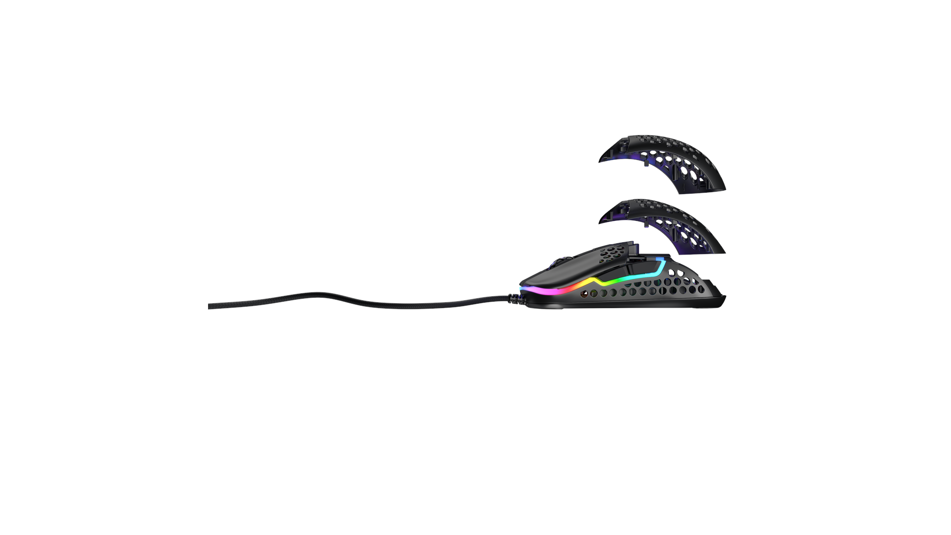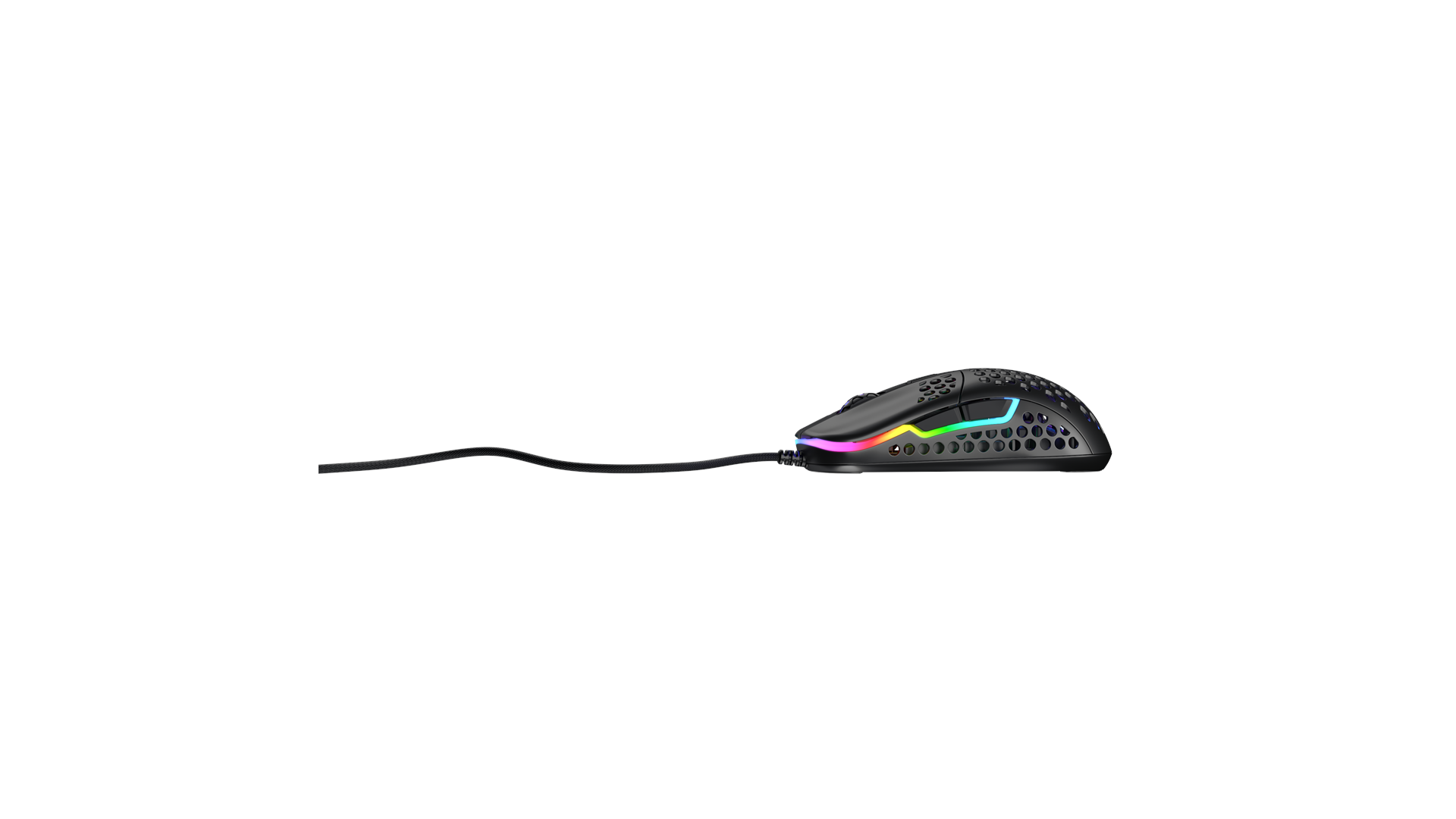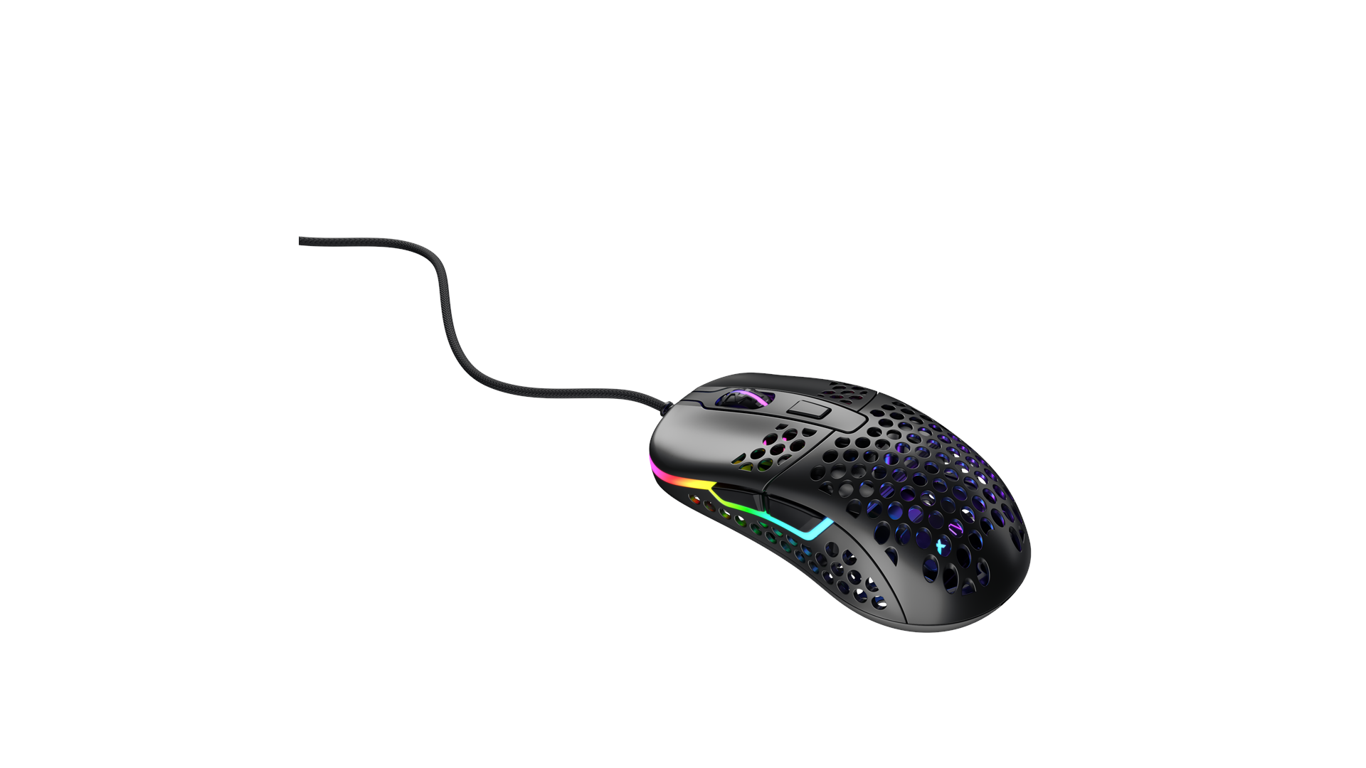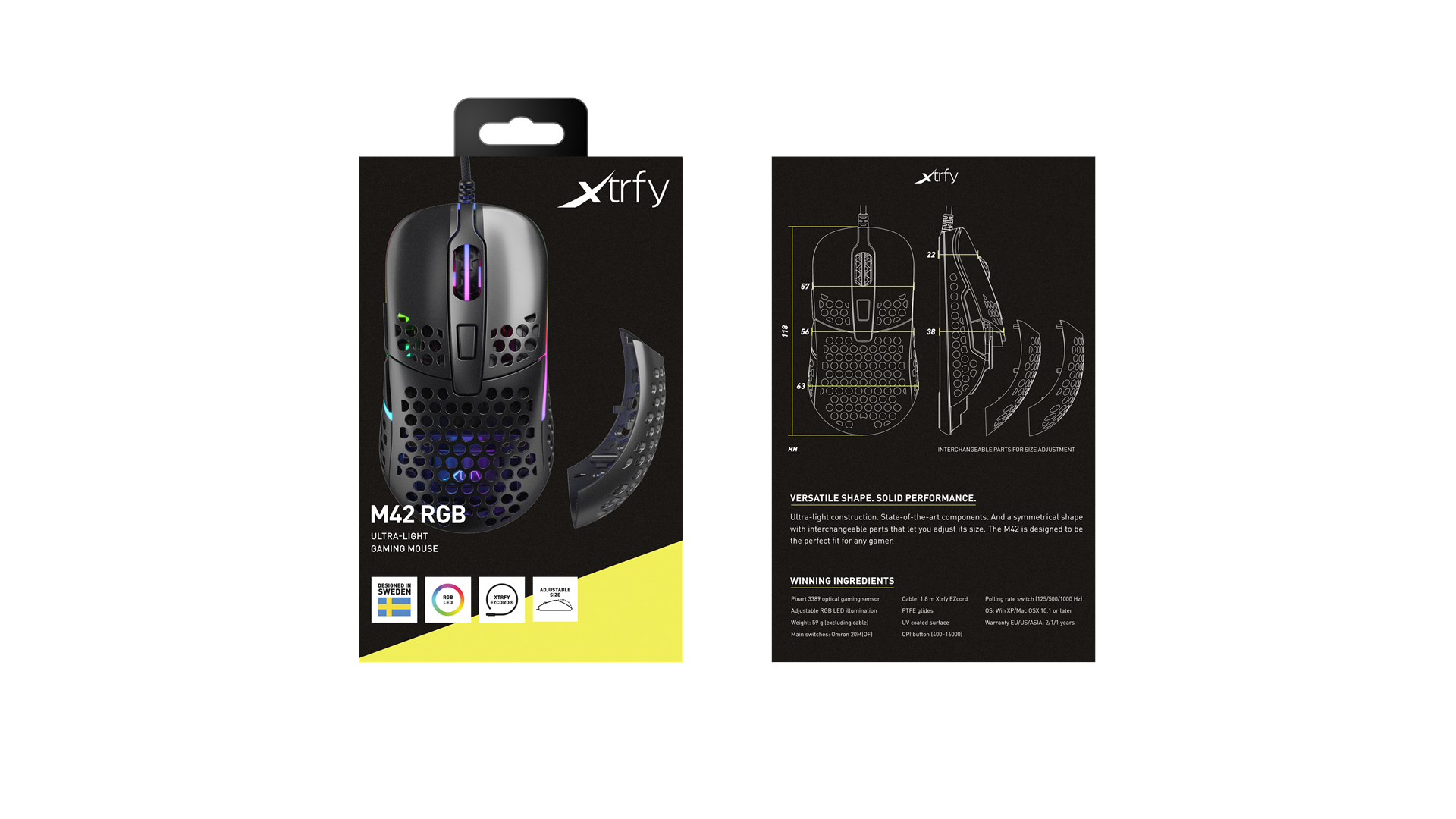 Scrollhjul, ARM 32-bit processor, justerbar RGB LED-belysning, Pixart 3389 optisk sensor, Omron 20M kontakter, Xtrfy EZcord-kabel, sprøjteresistent