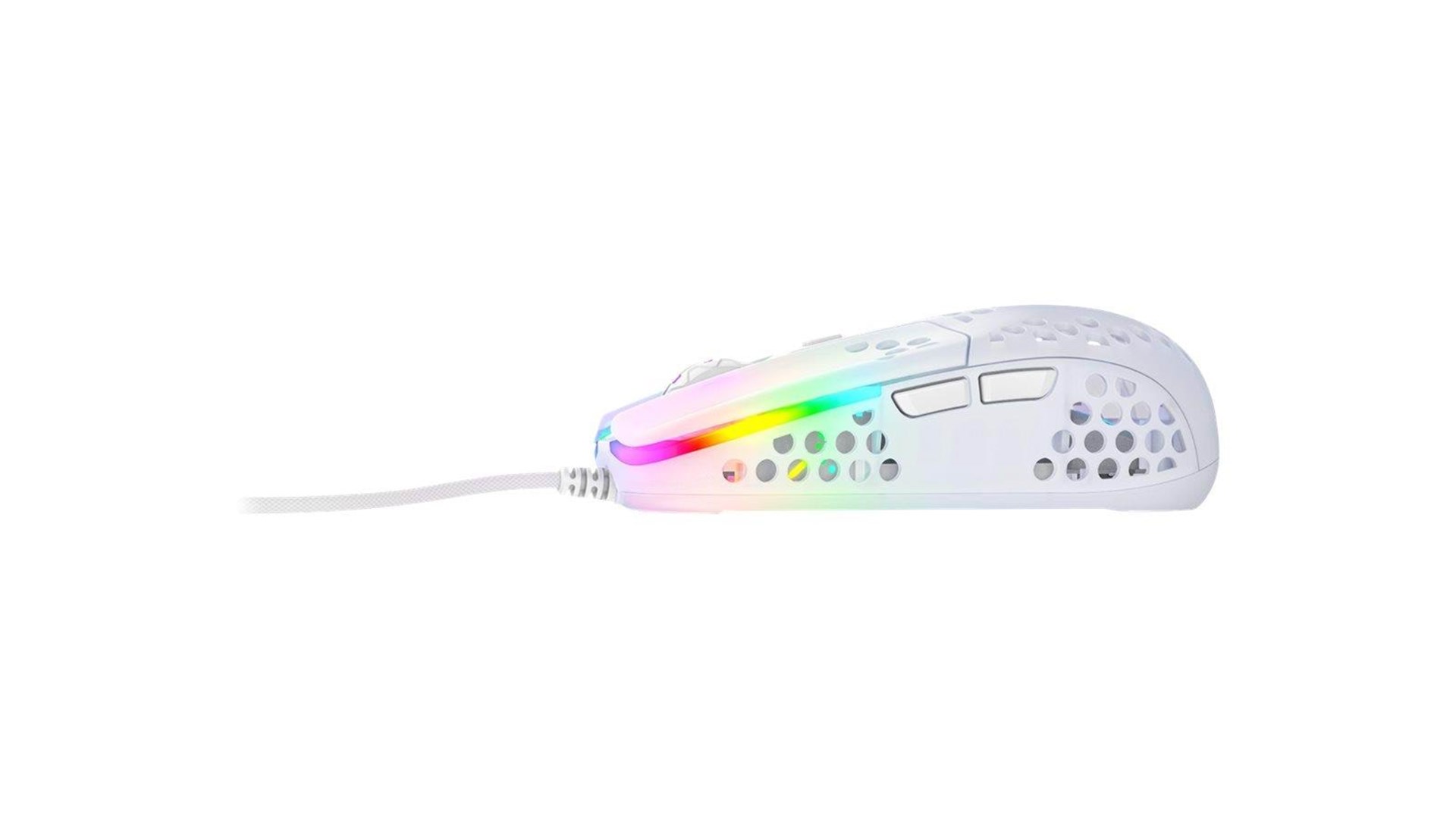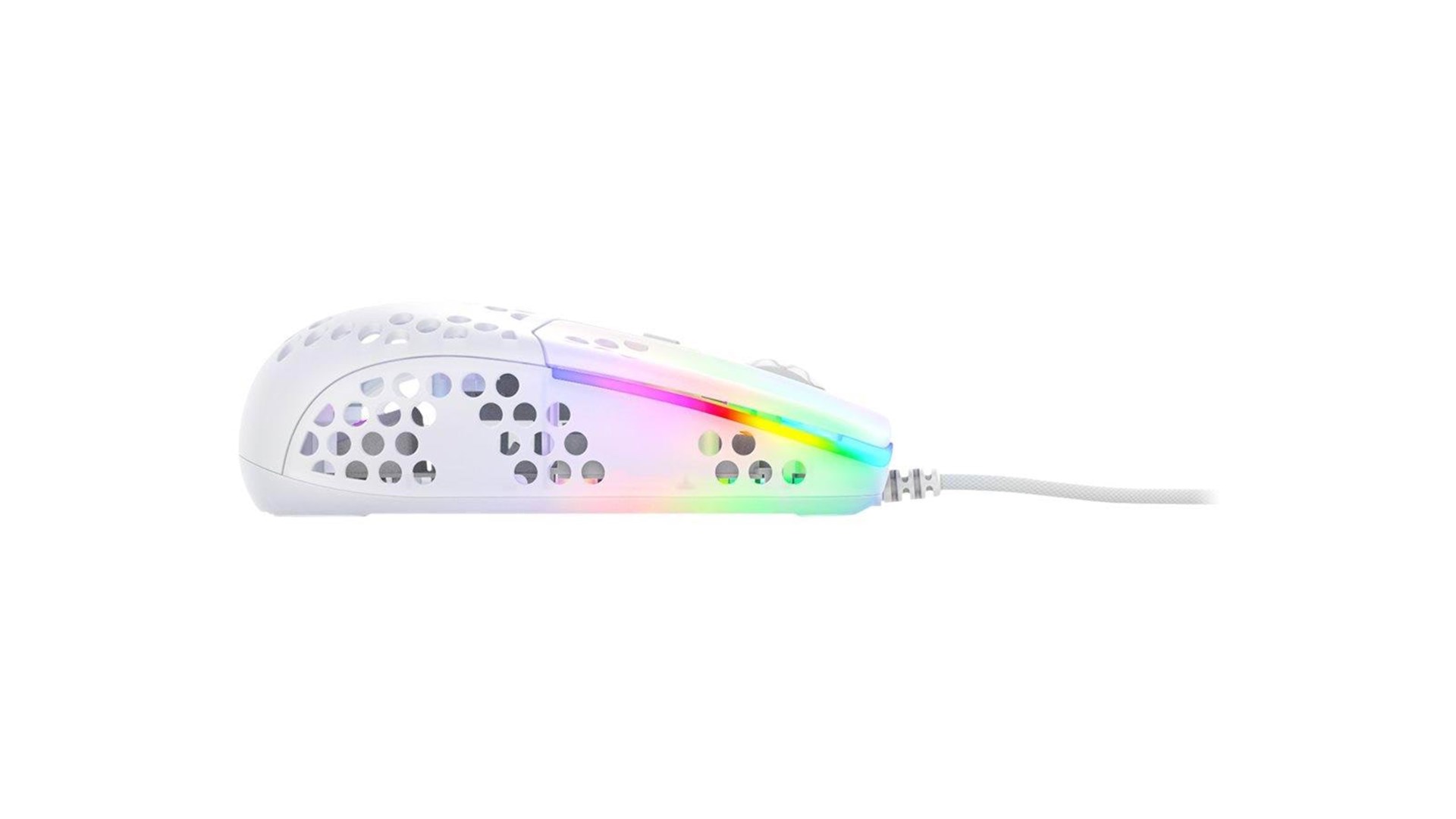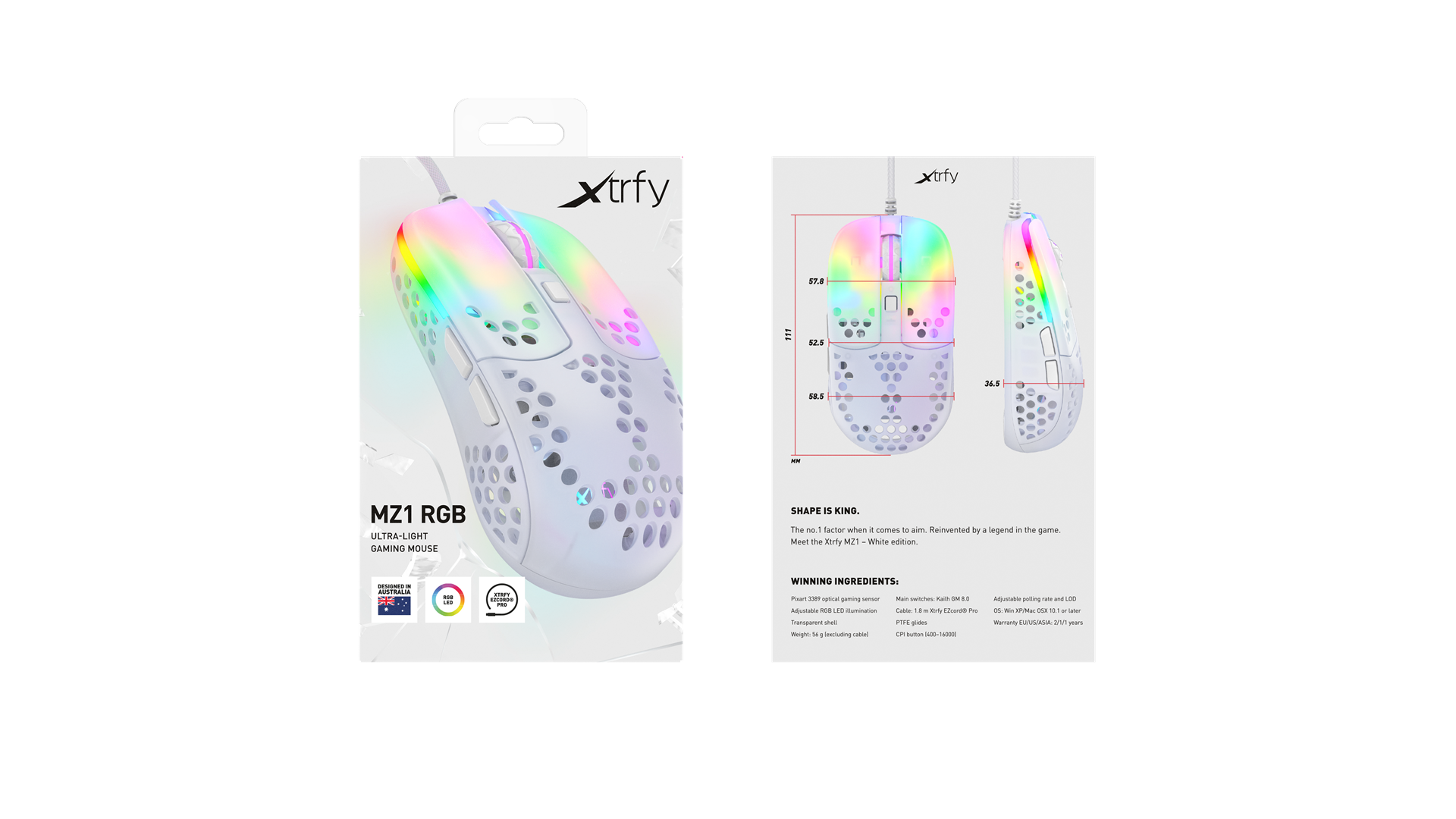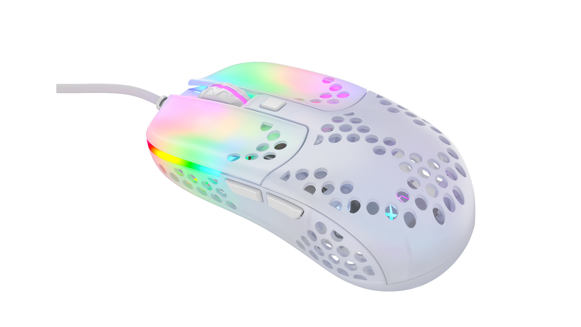 Scrollhjul, polytetrafluoroethylene (PTFE) feet, flettet kabel, ARM 32-bit processor, Pixart 3389 optisk sensor, Kailh GM 8.0 kontakter