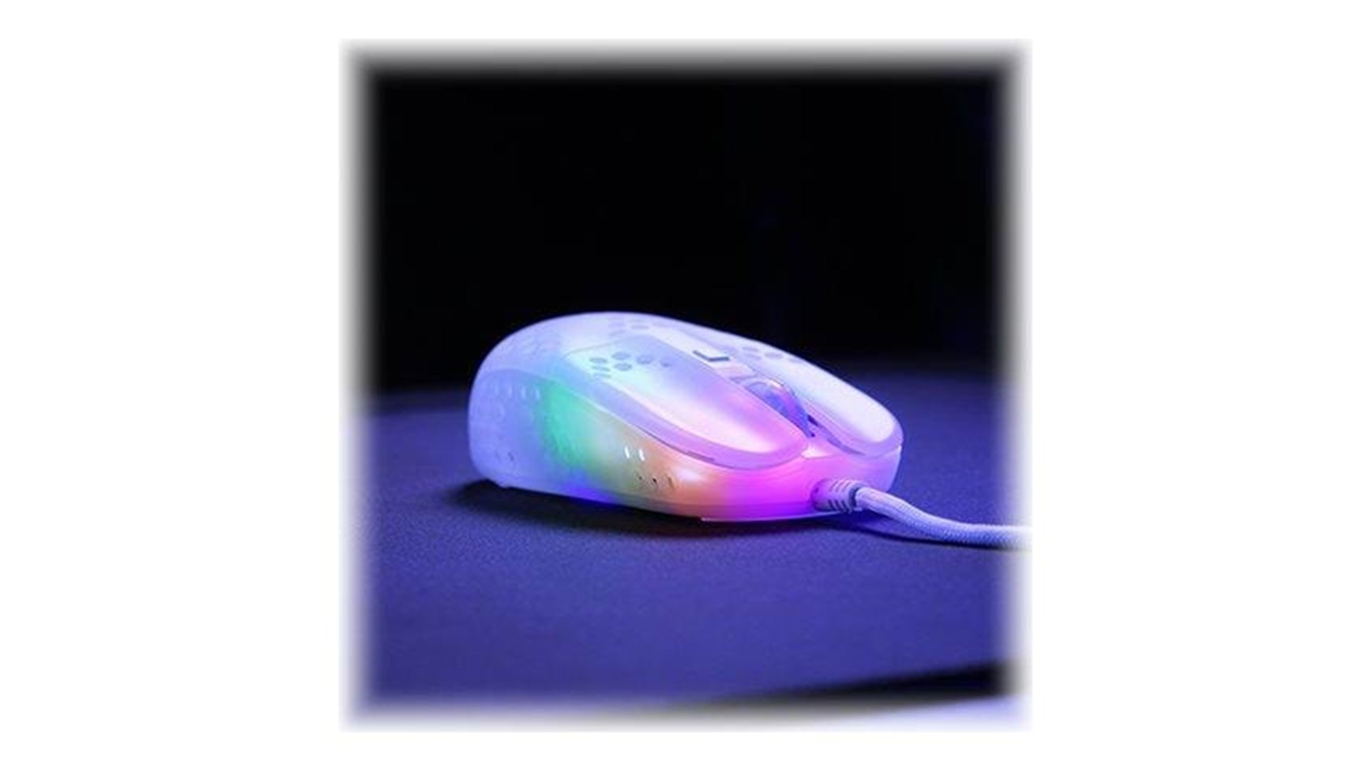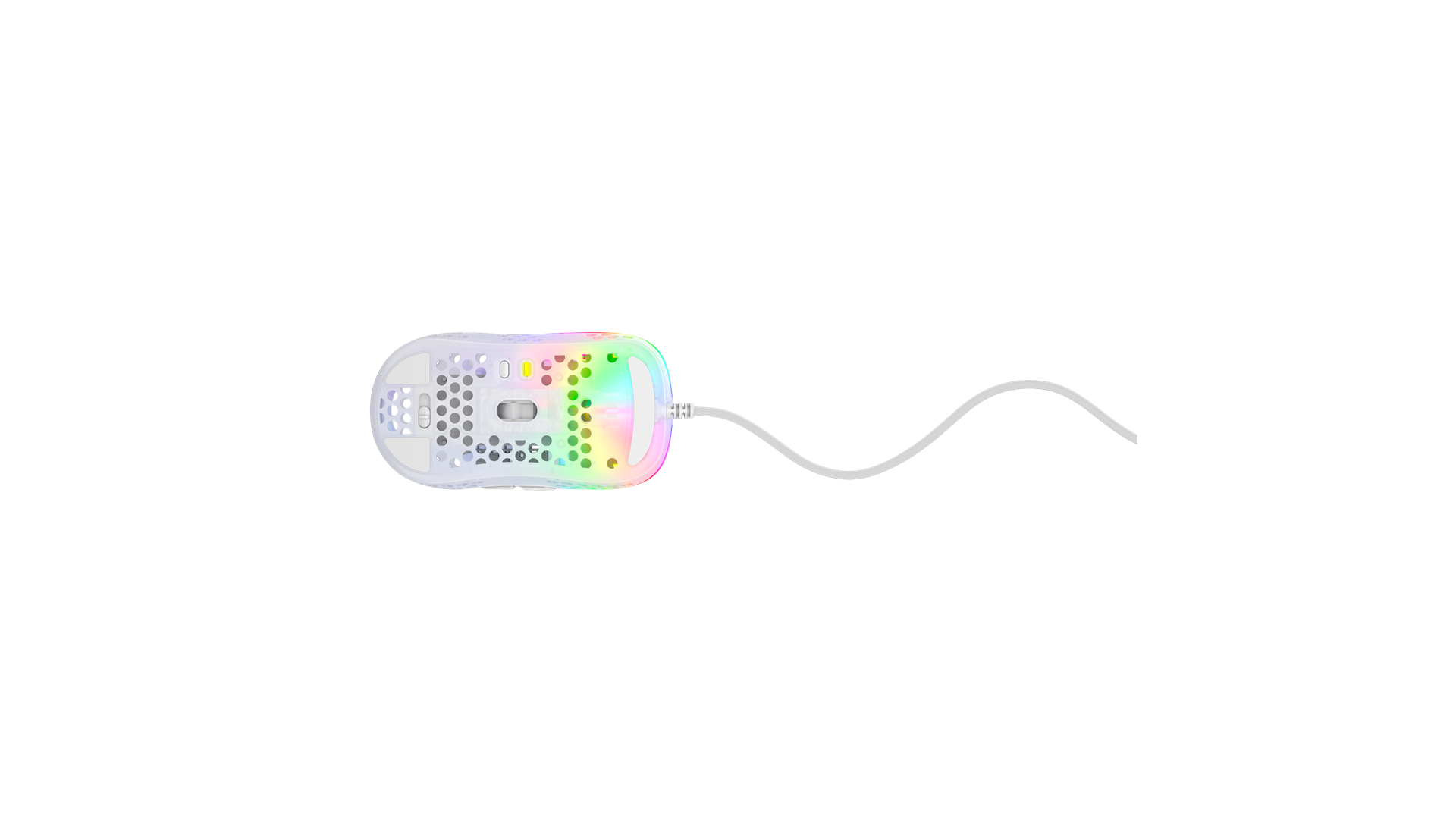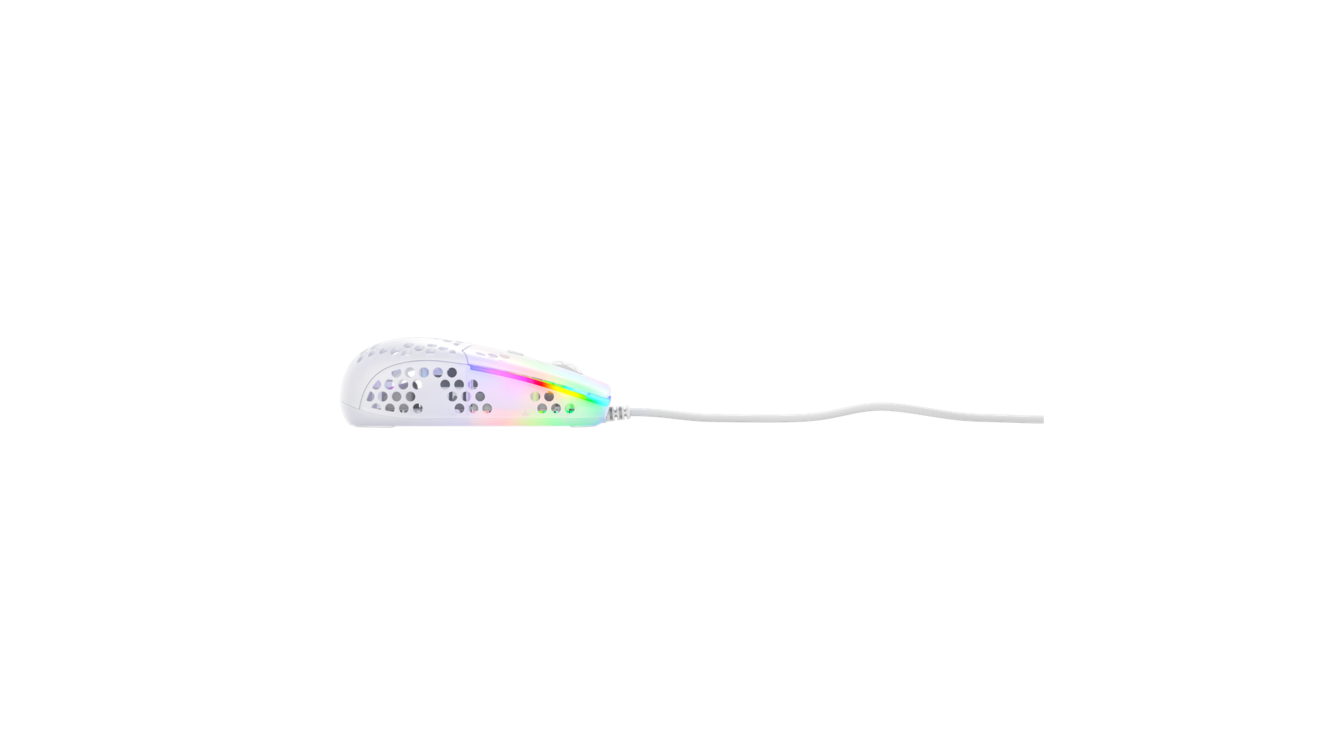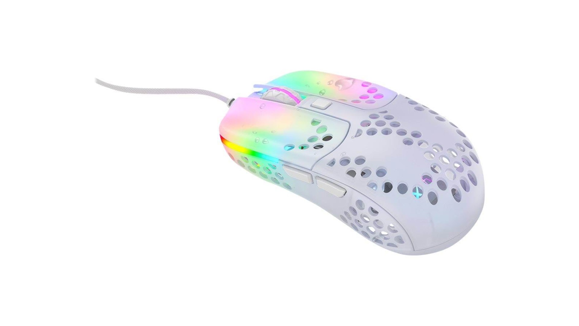 Scrollhjul, polytetrafluoroethylene (PTFE) feet, flettet kabel, ARM 32-bit processor, Pixart 3389 optisk sensor, Kailh GM 8.0 kontakter