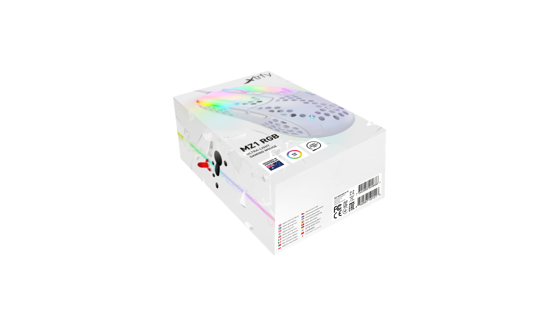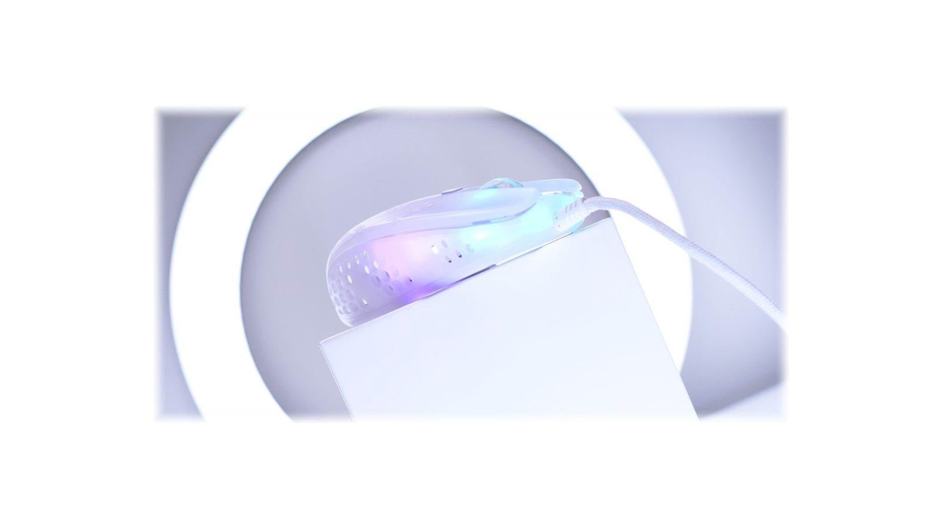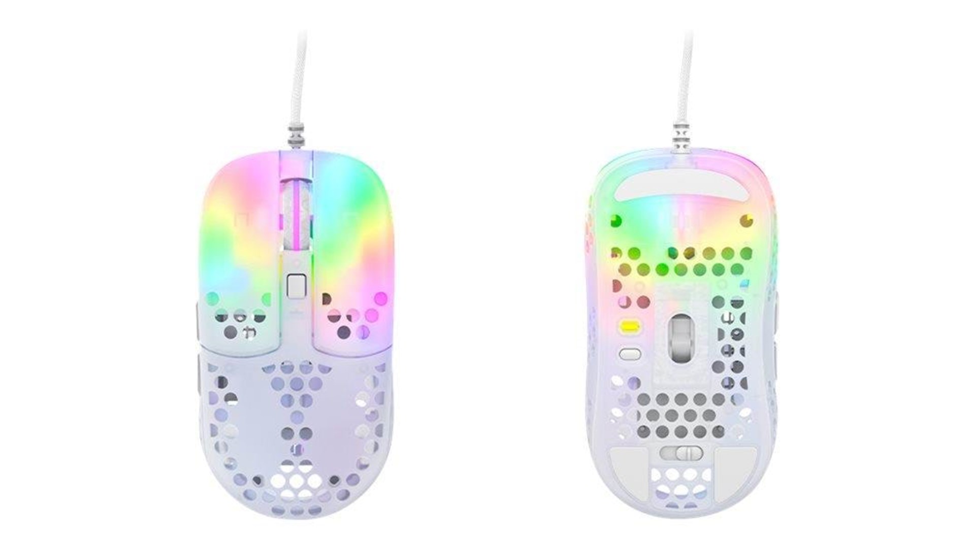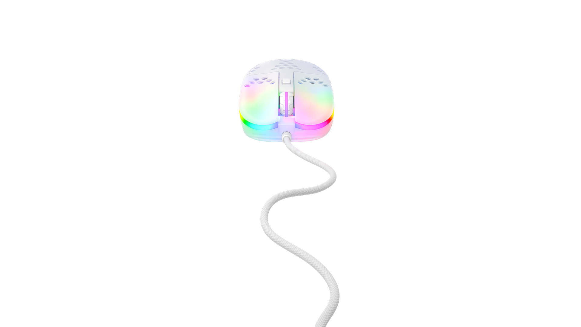 Scrollhjul, polytetrafluoroethylene (PTFE) feet, flettet kabel, ARM 32-bit processor, Pixart 3389 optisk sensor, Kailh GM 8.0 kontakter