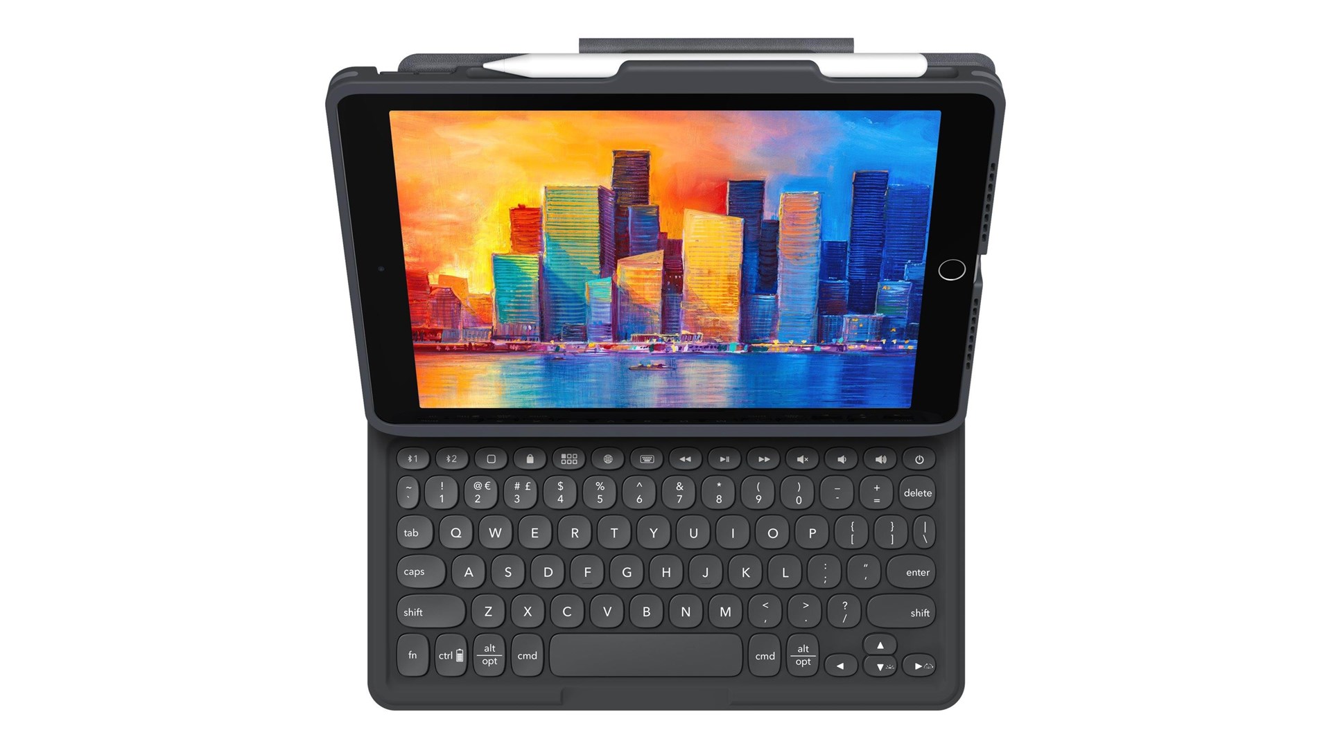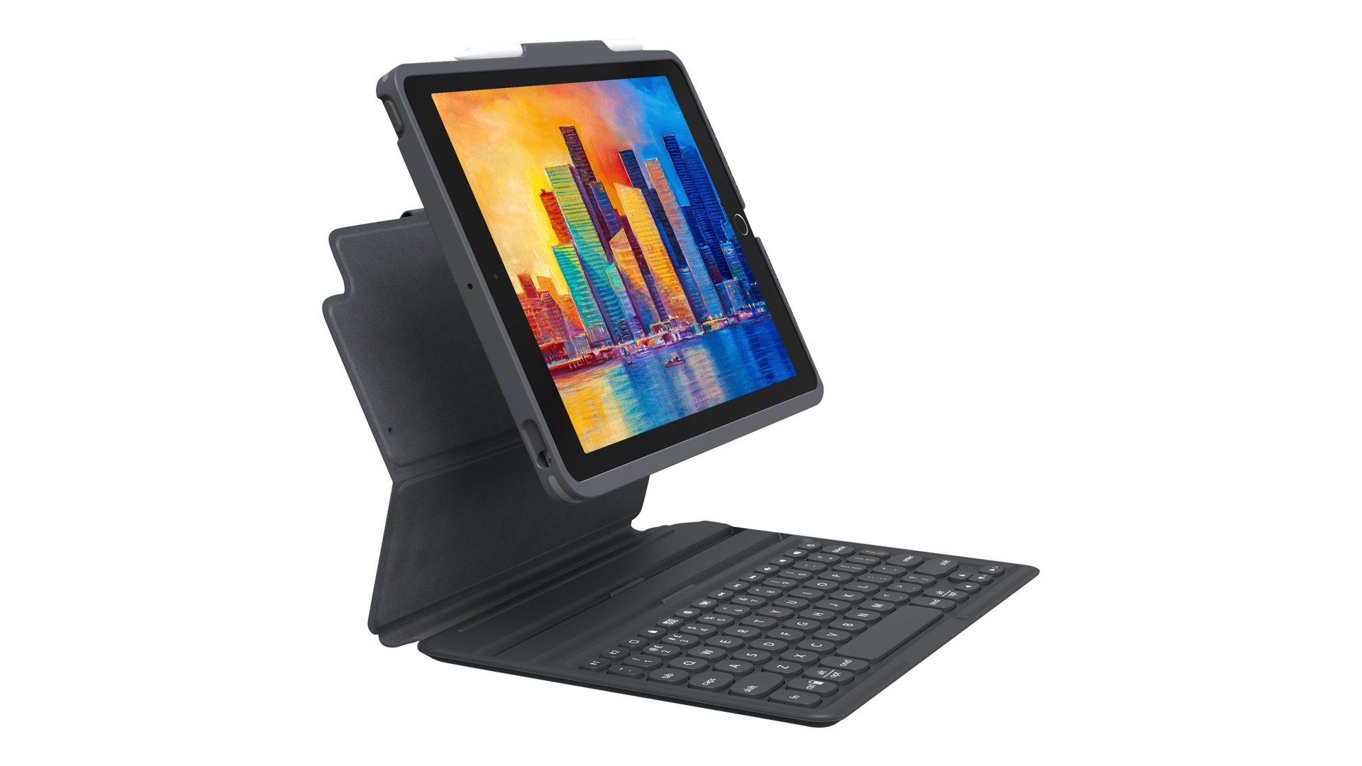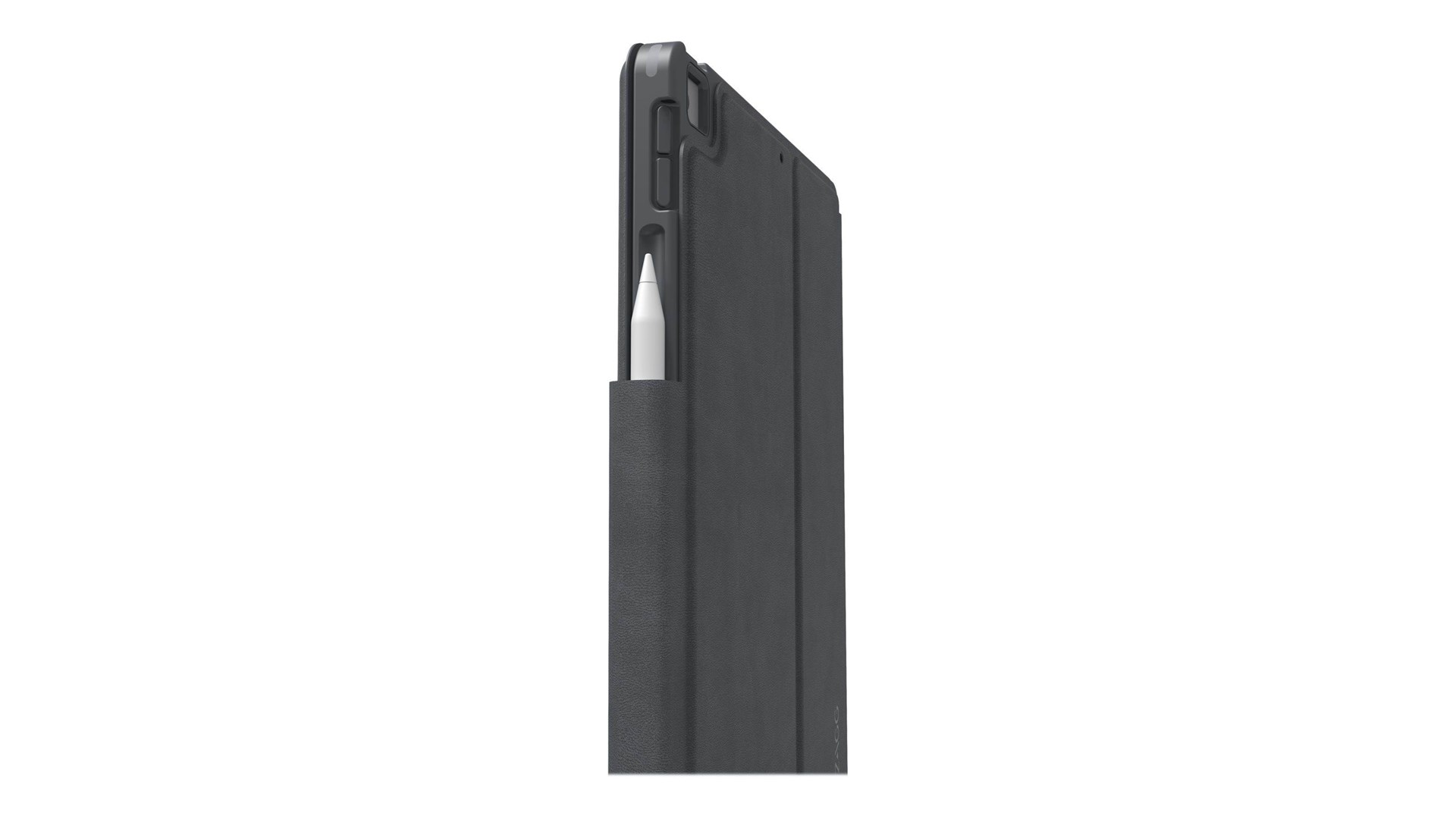 Hjørnebeskyttelses system, magnetisk lukning, transformerbar til en stander til at skrive eller se video, sove/vække-funktion, gummificerede kanter, Apple-blyantholder, taster i laptop-stil, 10,2" tabletsupport, tabebeskyttelse op til 2 m, magnetisk stander