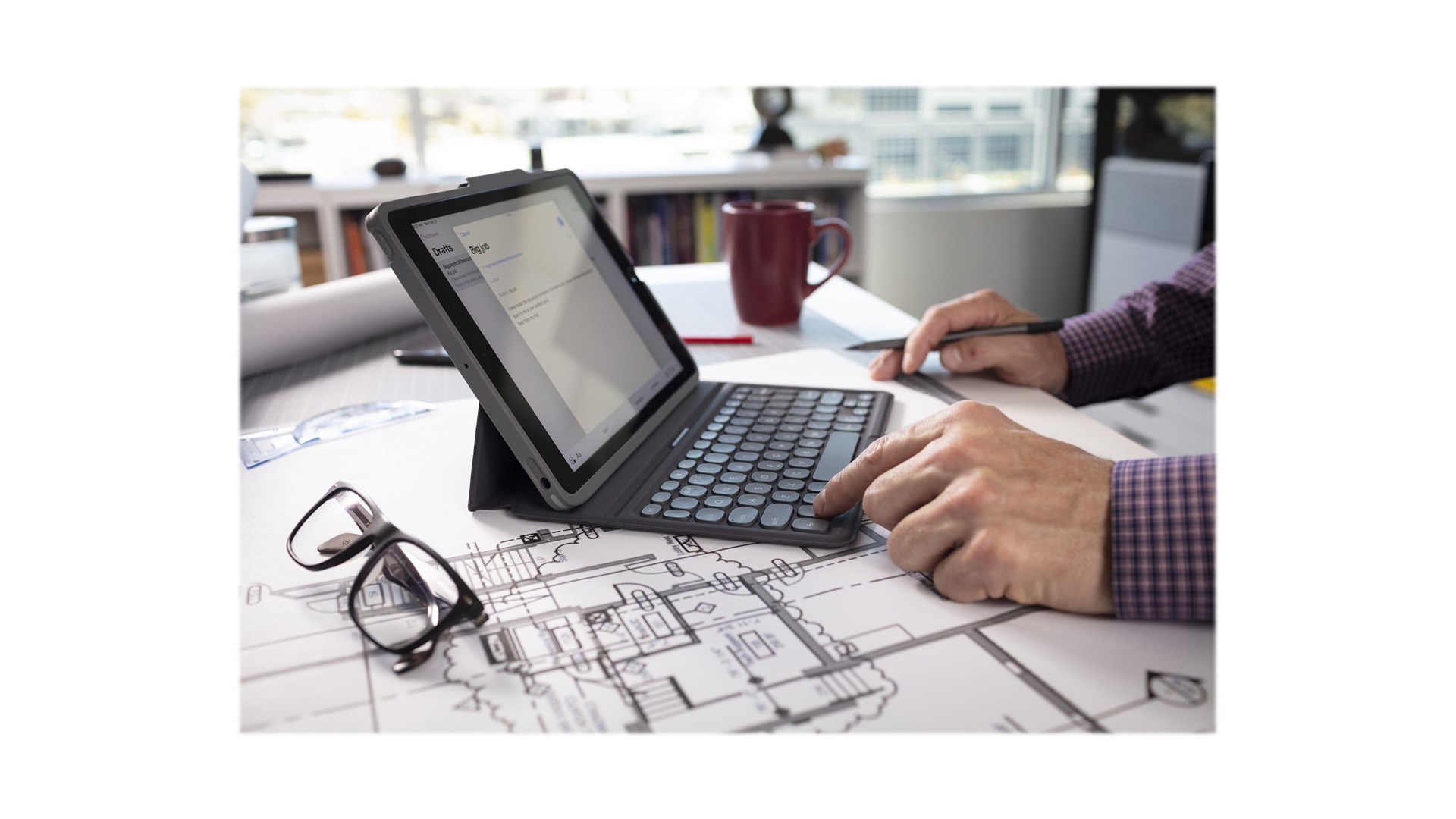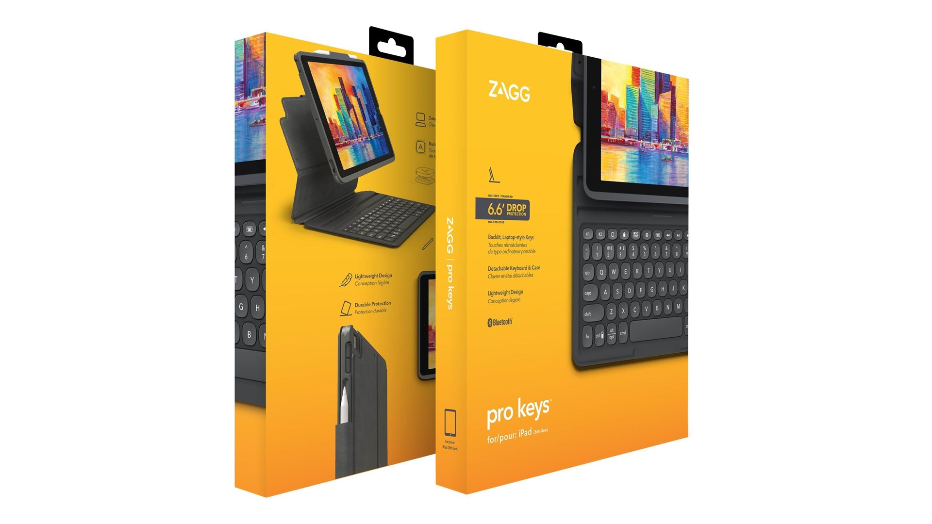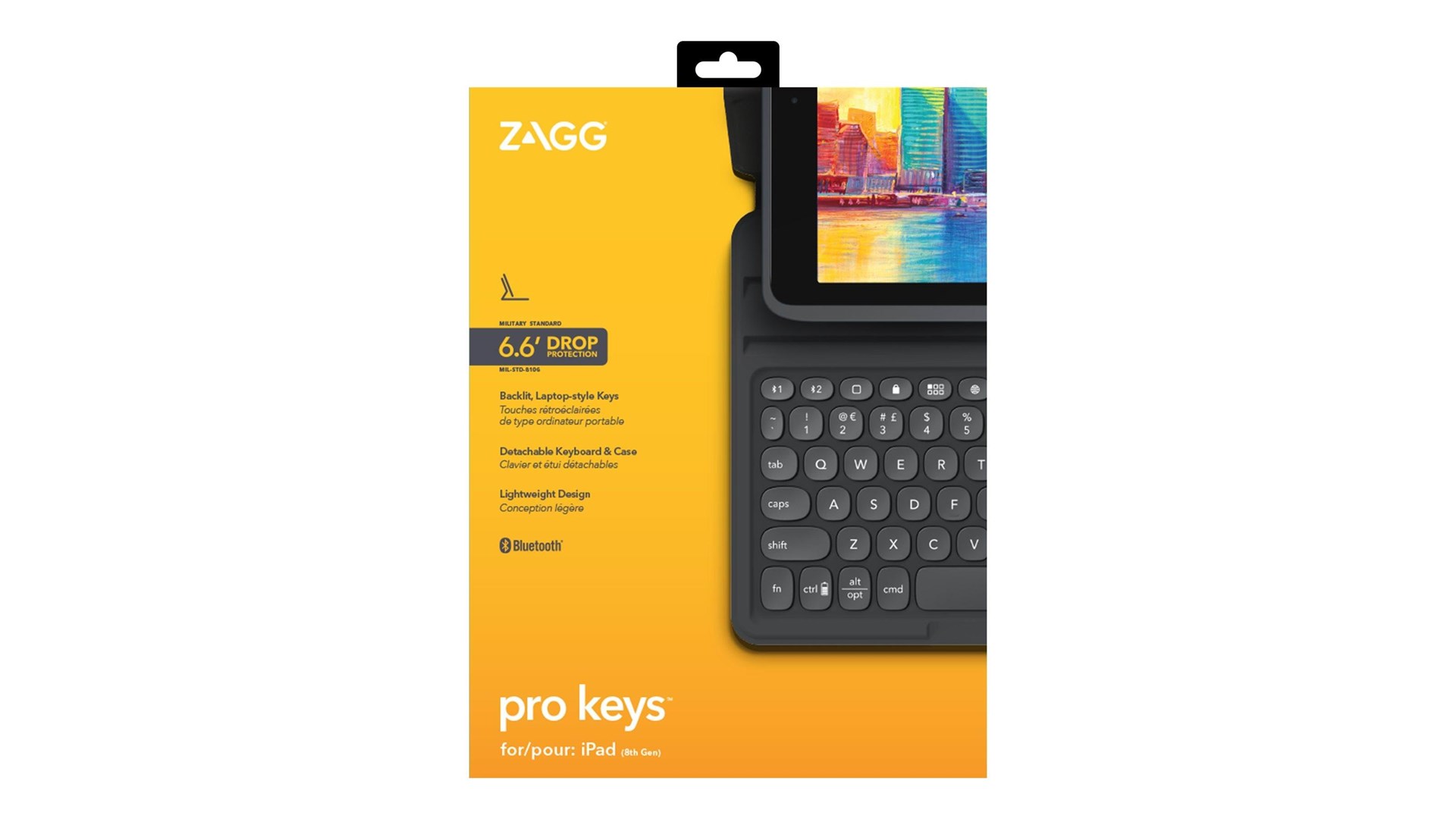 Hjørnebeskyttelses system, magnetisk lukning, transformerbar til en stander til at skrive eller se video, sove/vække-funktion, gummificerede kanter, Apple-blyantholder, taster i laptop-stil, 10,2" tabletsupport, tabebeskyttelse op til 2 m, magnetisk stander